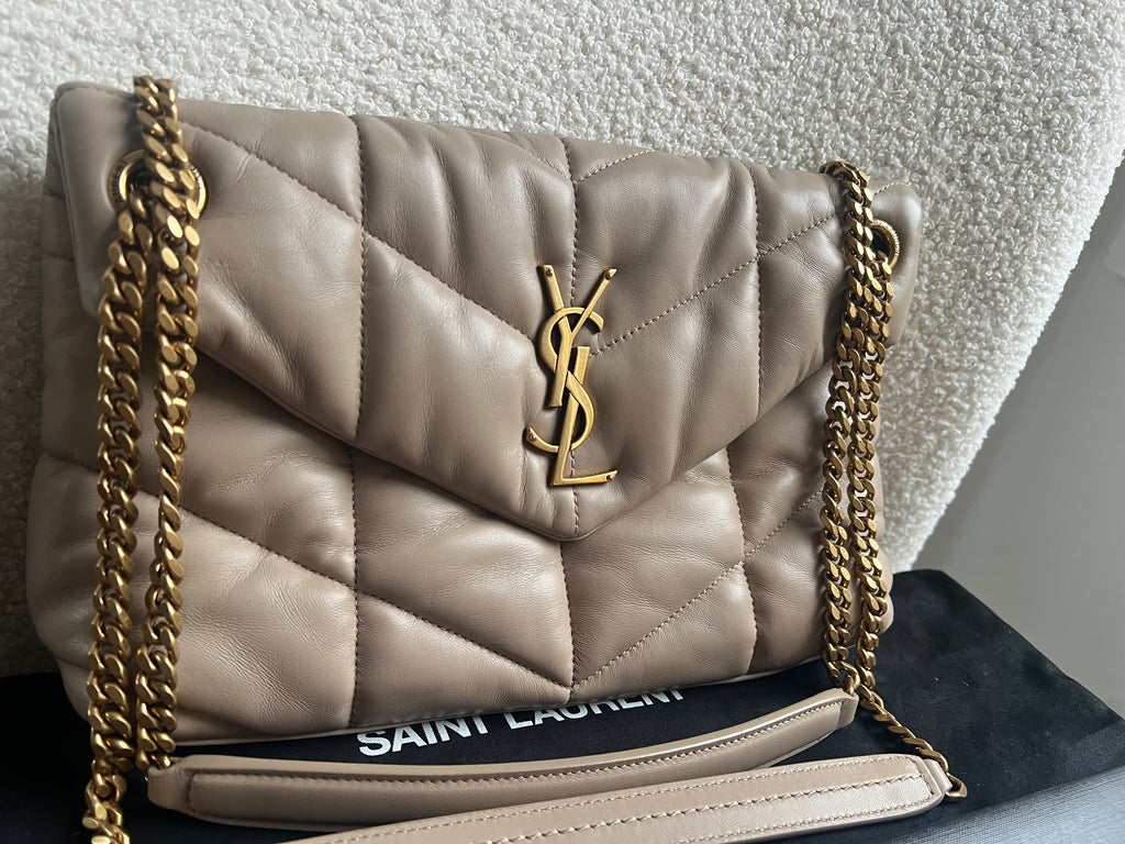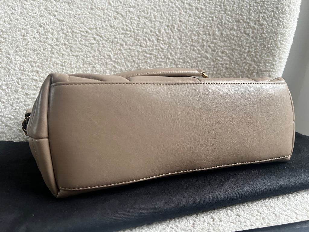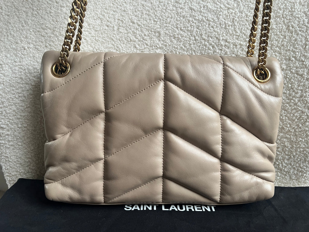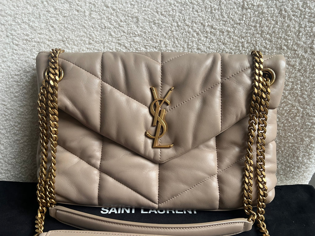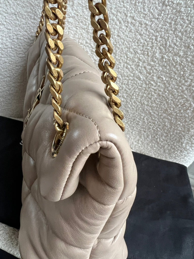 YSL Small Puffer Bag Beige Quilted Lambskin with gold hardware. This satchel style puffer bag is slightly slouchy and features the YSL hardware and has flap and magnetic snap closure. The quilted leather is incredibly soft and luxurious and is an ideal size for day to day or weekend wear. The sliding chain strap means it can be worn with the strap doubled or lengthened. This versatile style can be worn with both casual and glam outfits. Can be worn over shoulder or cross body with the strap either doubled up or lengthened.
