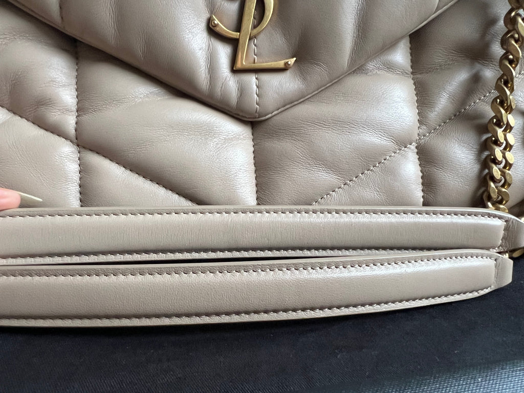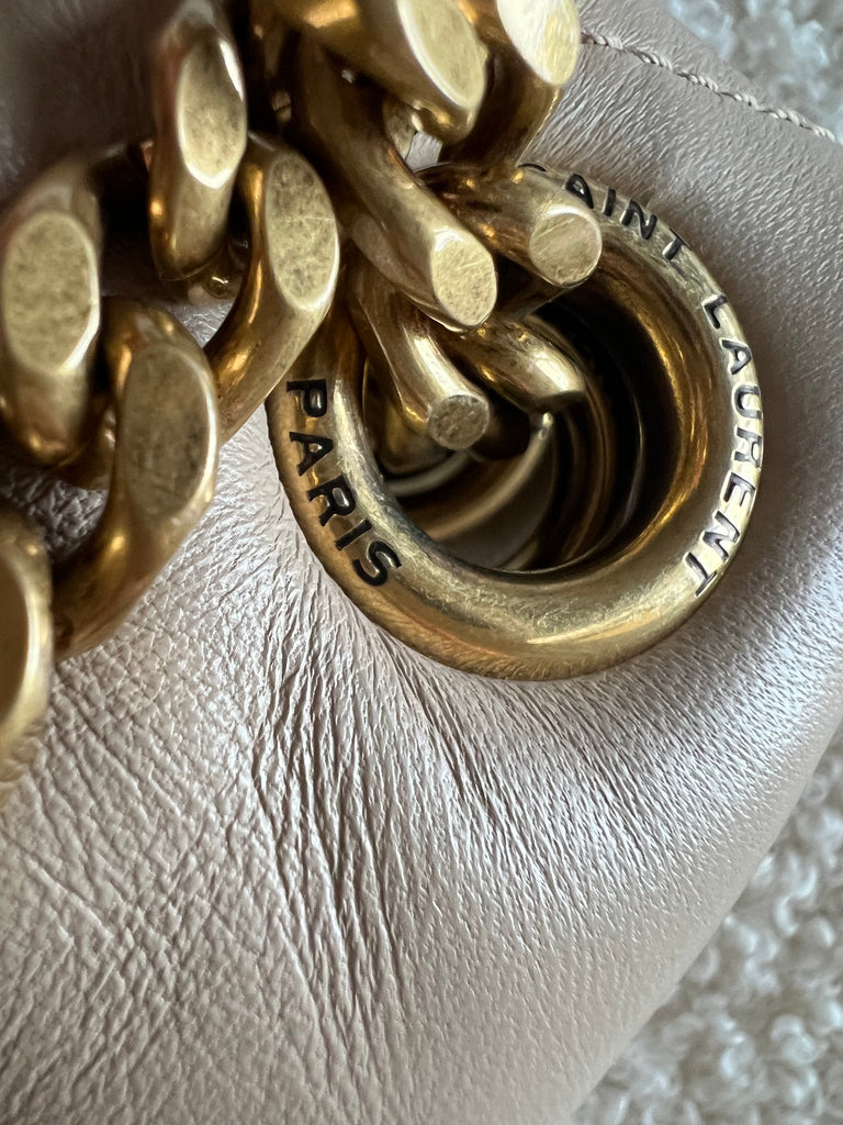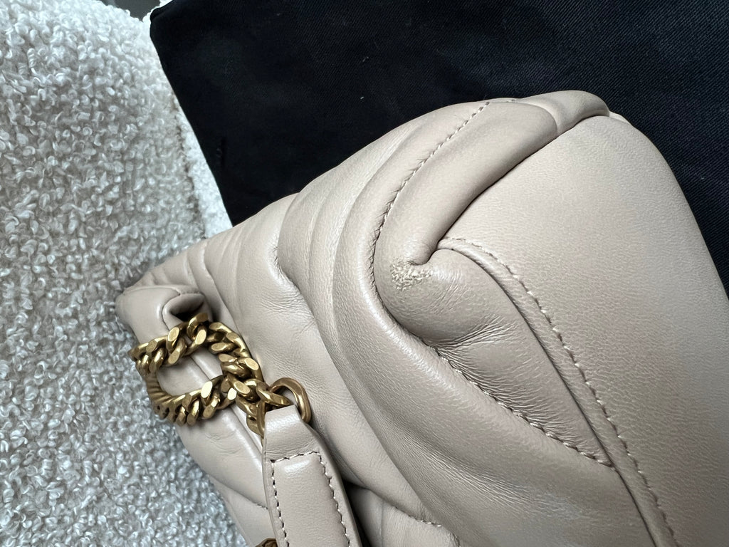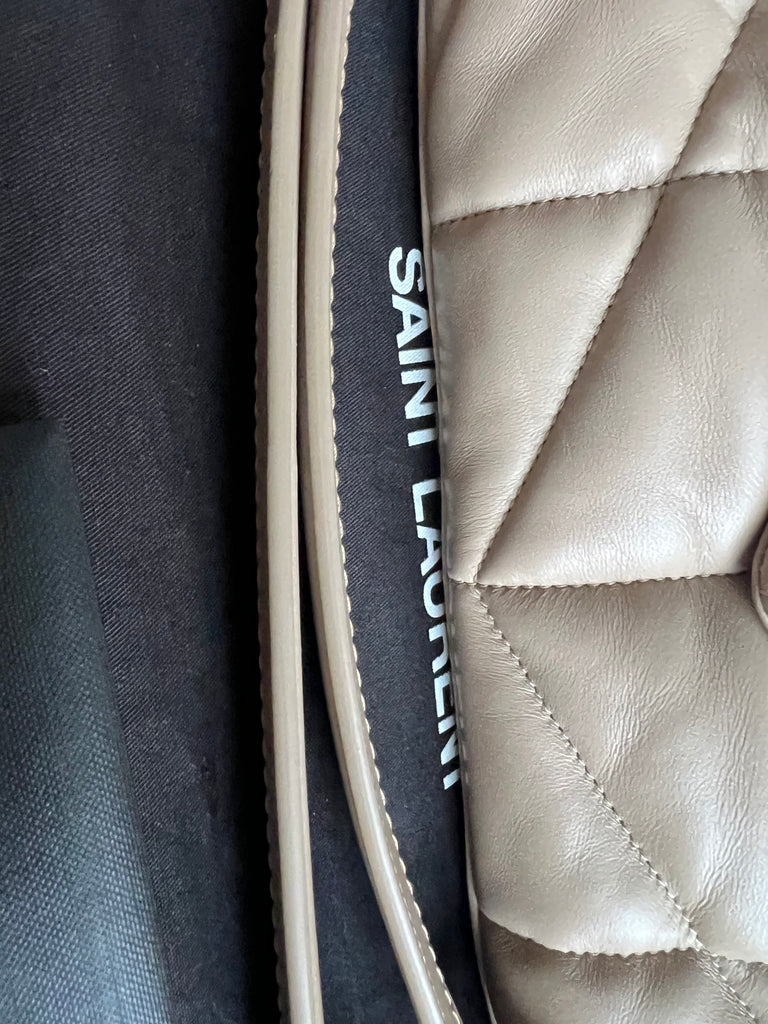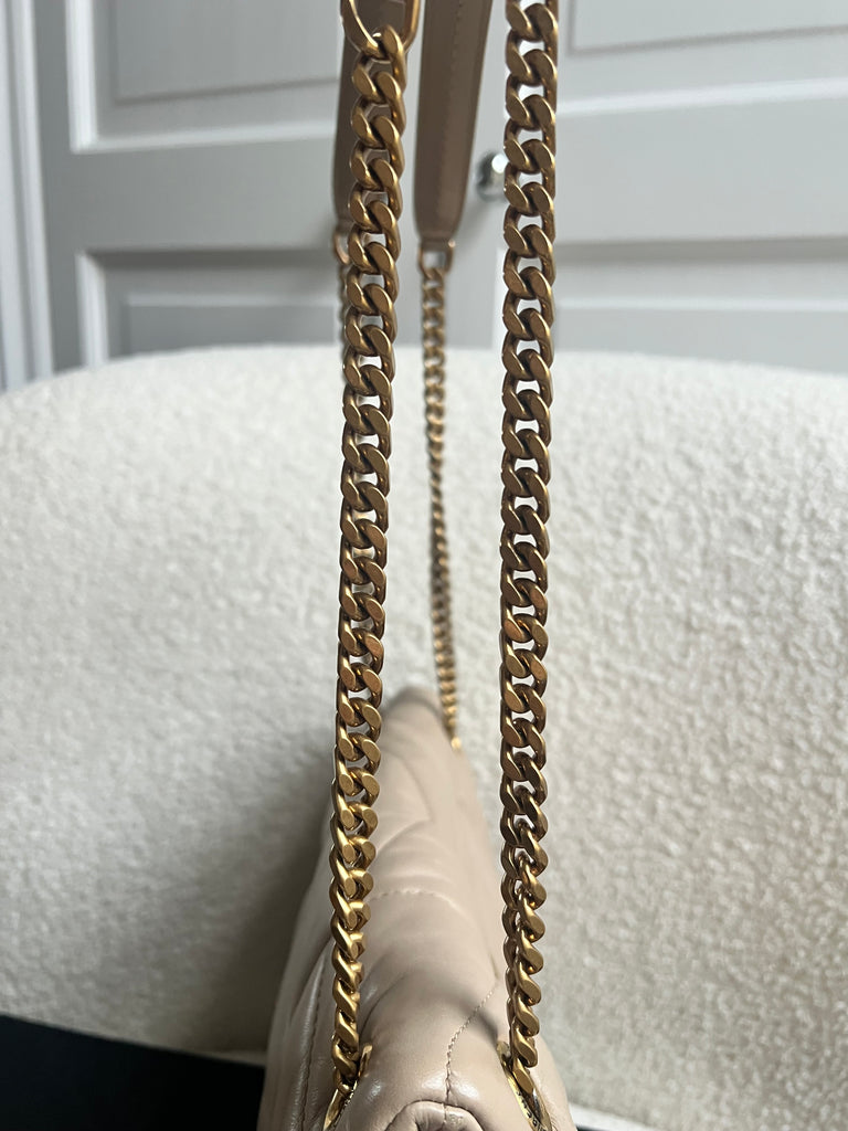 YSL Small Puffer Bag Beige Quilted Lambskin with gold hardware. This satchel style puffer bag is slightly slouchy and features the YSL hardware and has flap and magnetic snap closure. The quilted leather is incredibly soft and luxurious and is an ideal size for day to day or weekend wear. The sliding chain strap means it can be worn with the strap doubled or lengthened. This versatile style can be worn with both casual and glam outfits. Can be worn over shoulder or cross body with the strap either doubled up or lengthened.