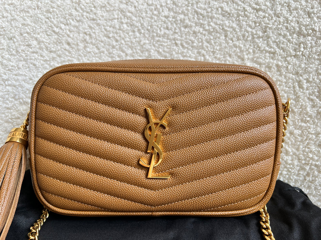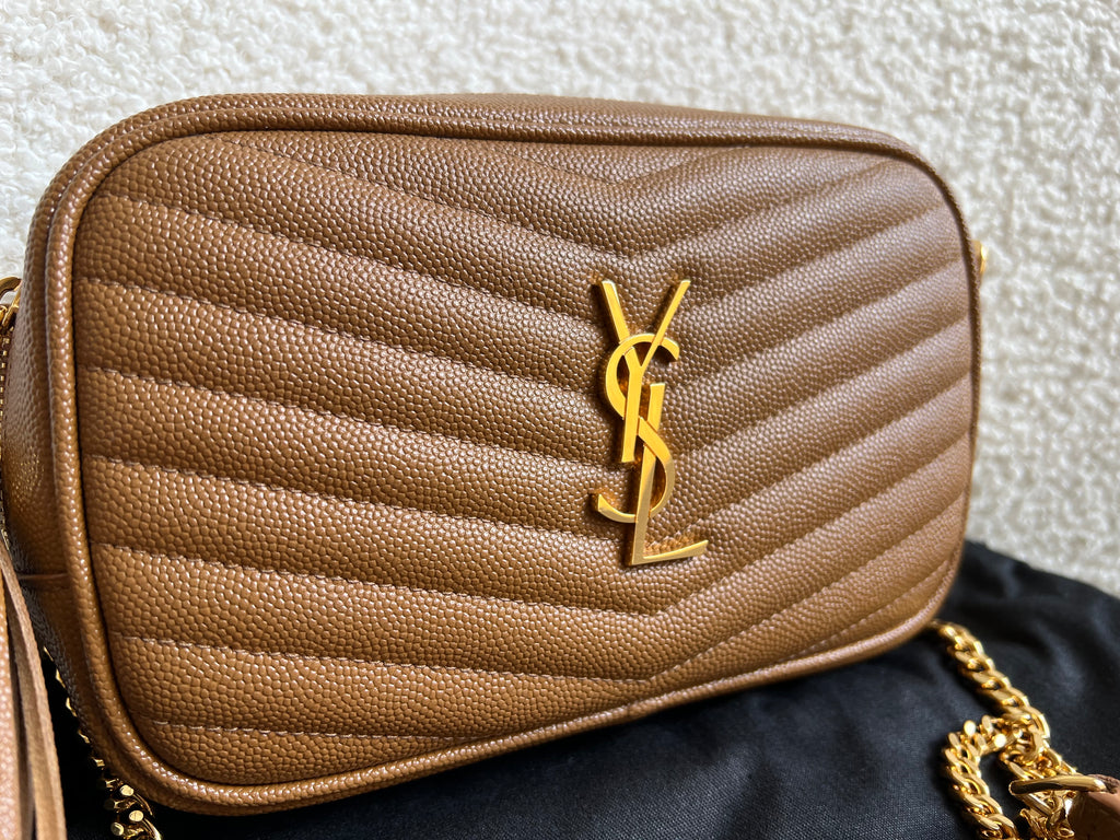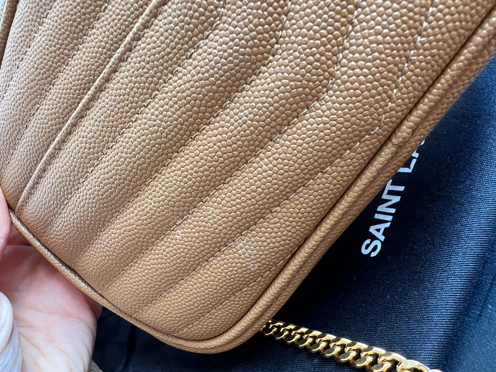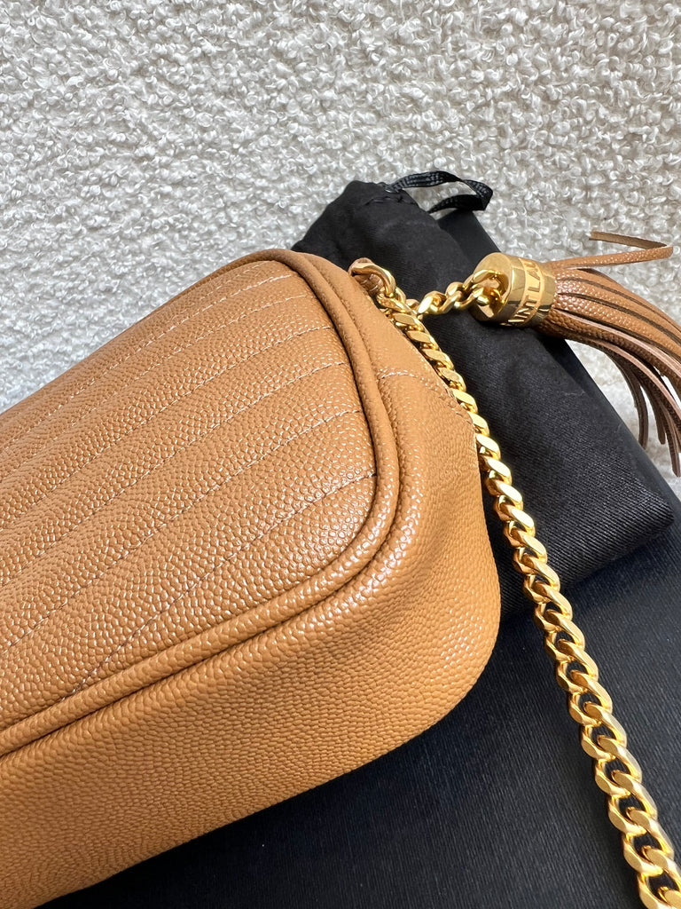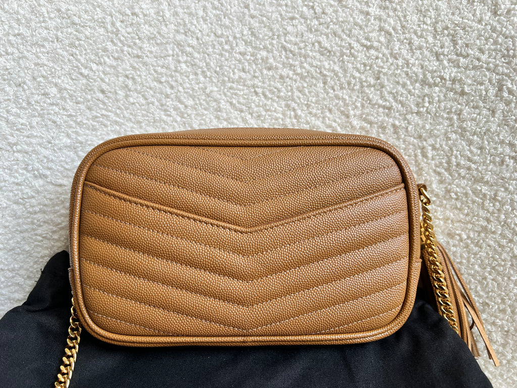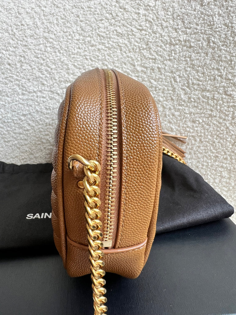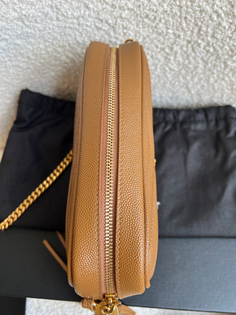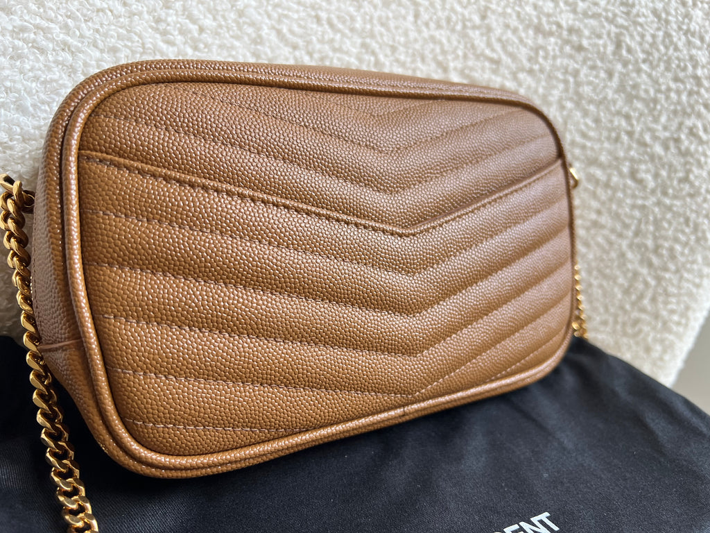 YSL Mini Lou Camera Bag in Tan quilted grain de poudre embossed leather with gold hardware. This mini camera bag style is structured in this robust grained leather. Zip around closure and long adjustable strap means it can be worn over shoulder or cross body. Ideal for day to night wear.