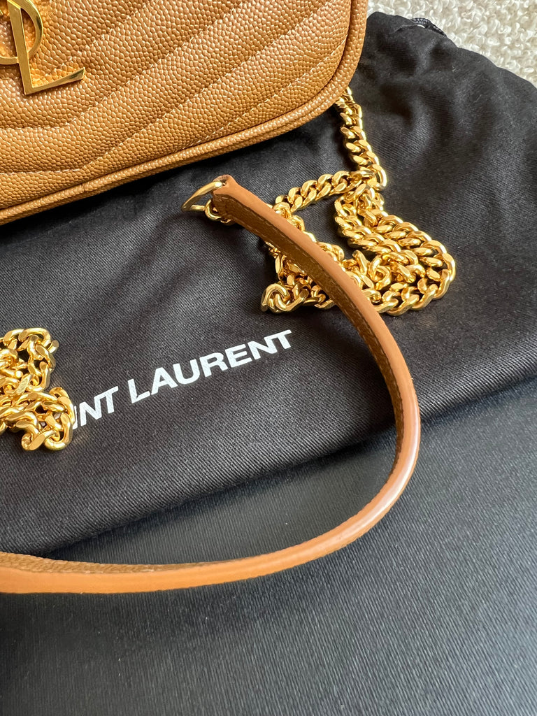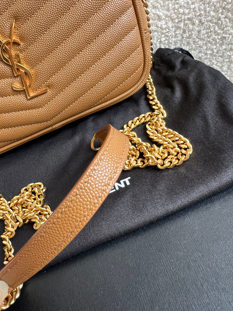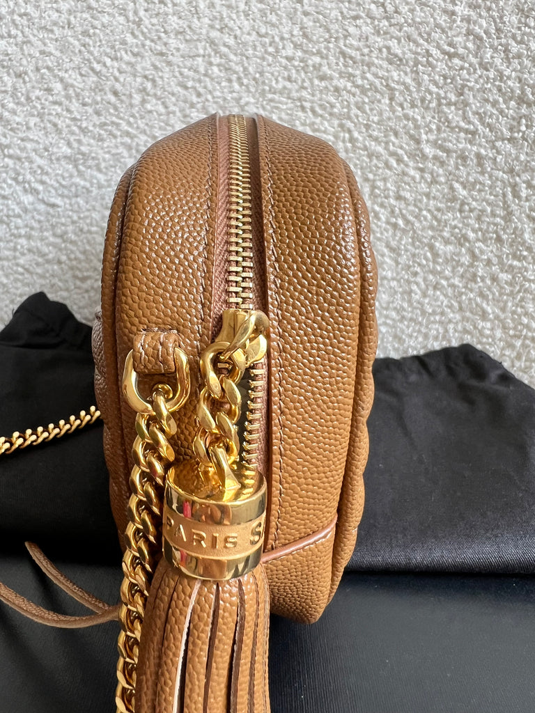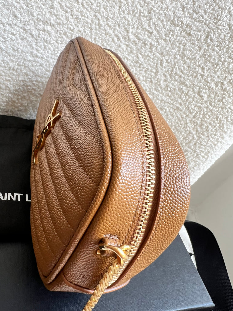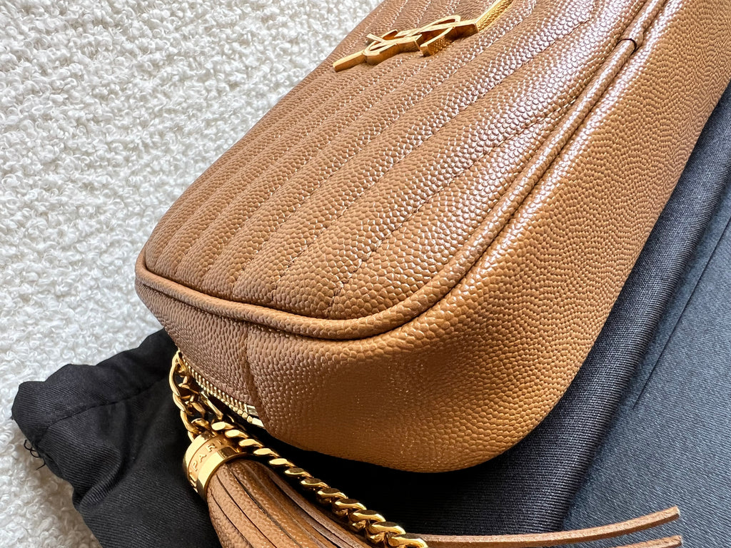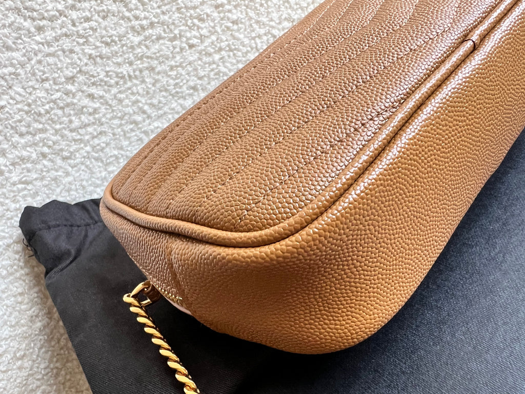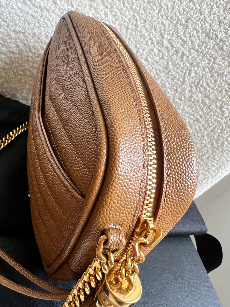 YSL Mini Lou Camera Bag in Tan quilted grain de poudre embossed leather with gold hardware. This mini camera bag style is structured in this robust grained leather. Zip around closure and long adjustable strap means it can be worn over shoulder or cross body. Ideal for day to night wear.