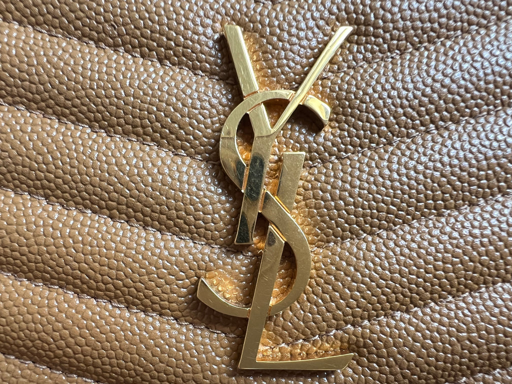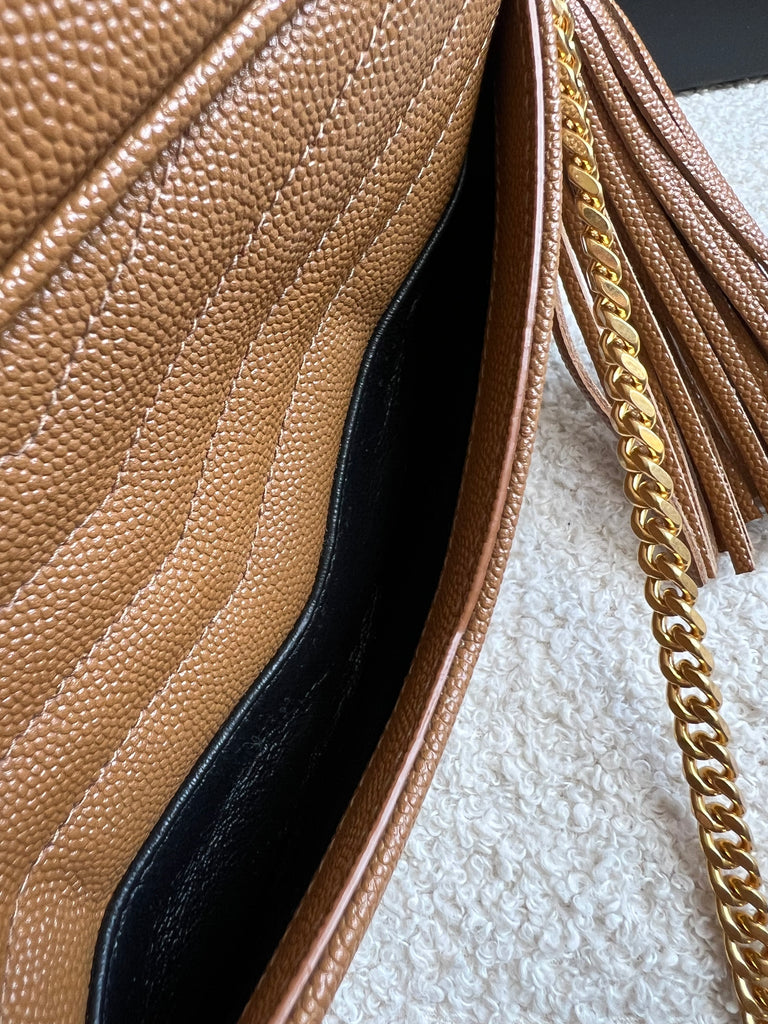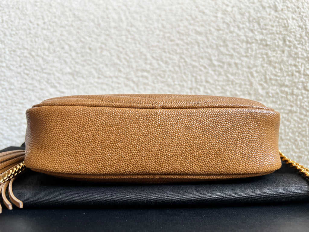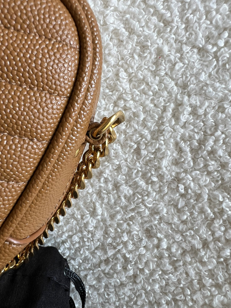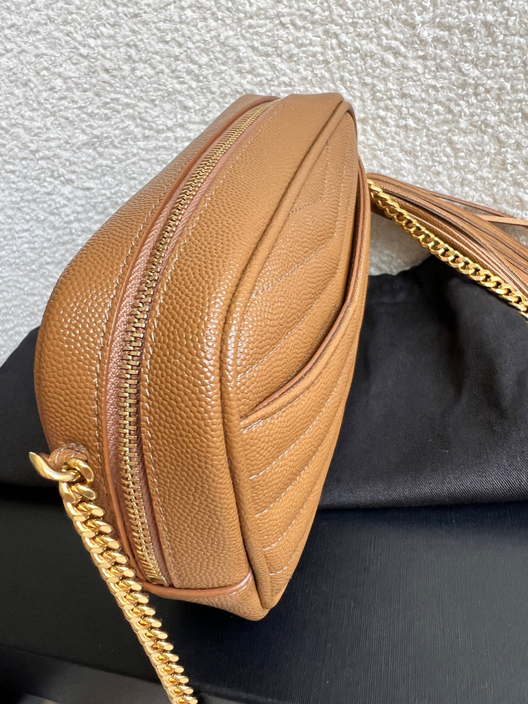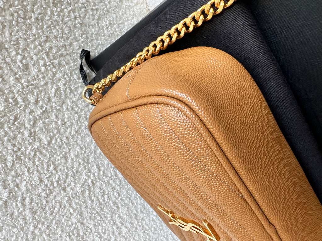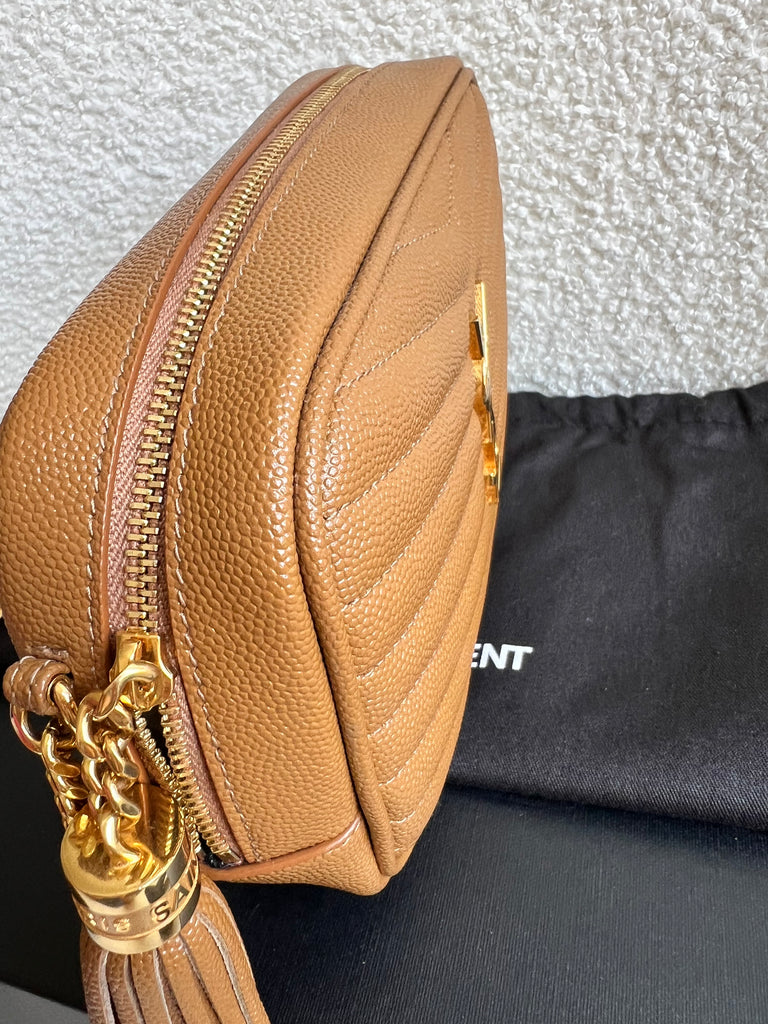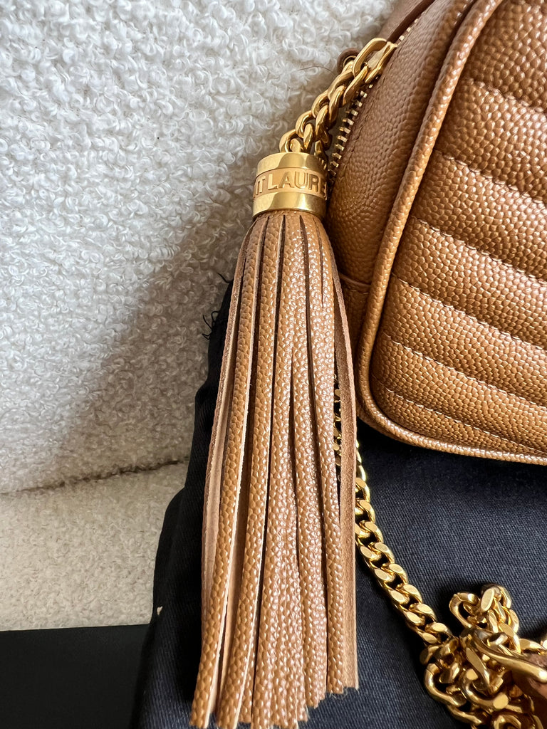 YSL Mini Lou Camera Bag in Tan quilted grain de poudre embossed leather with gold hardware. This mini camera bag style is structured in this robust grained leather. Zip around closure and long adjustable strap means it can be worn over shoulder or cross body. Ideal for day to night wear.