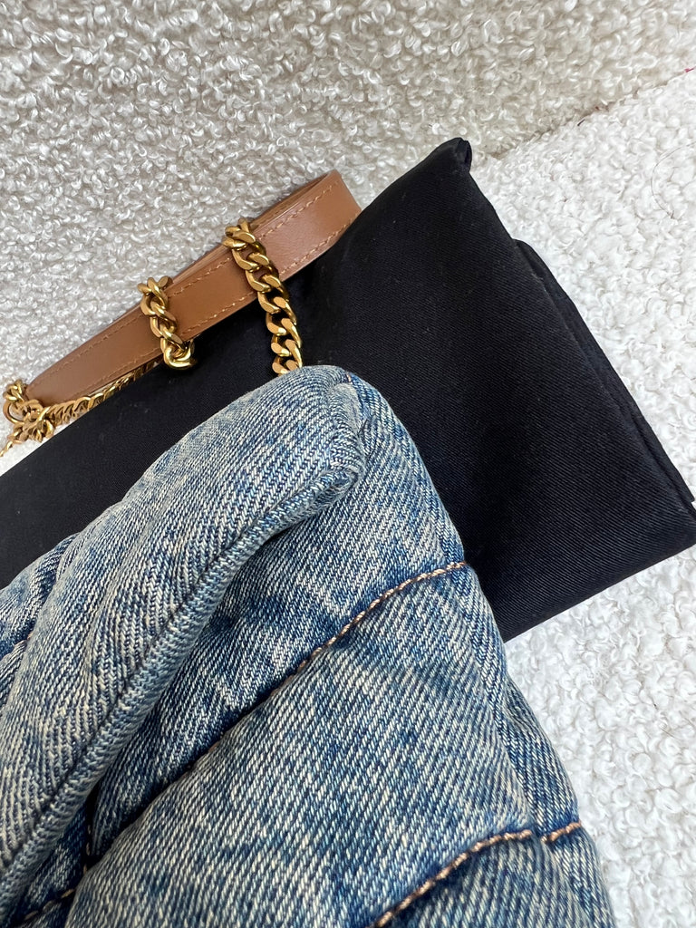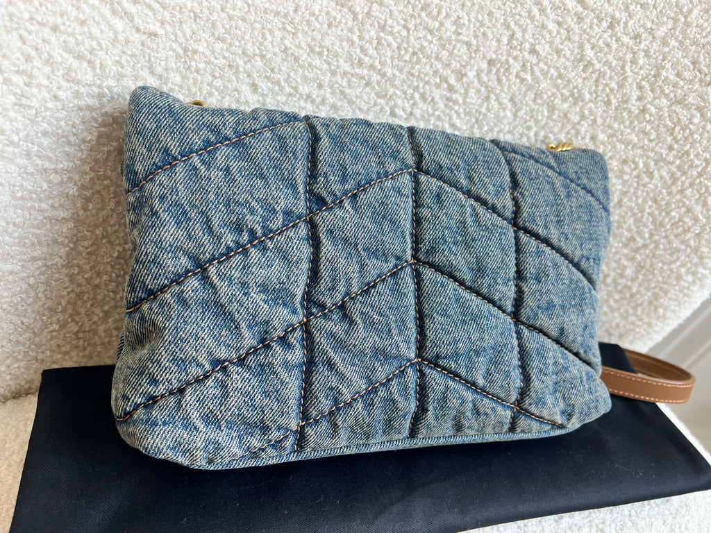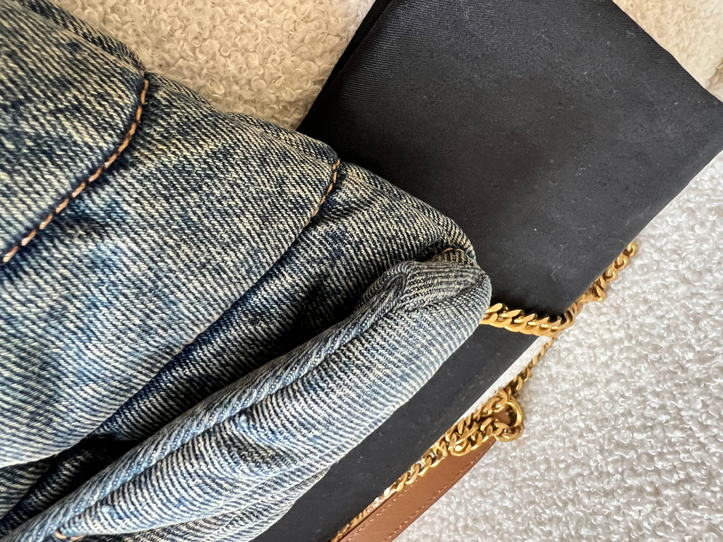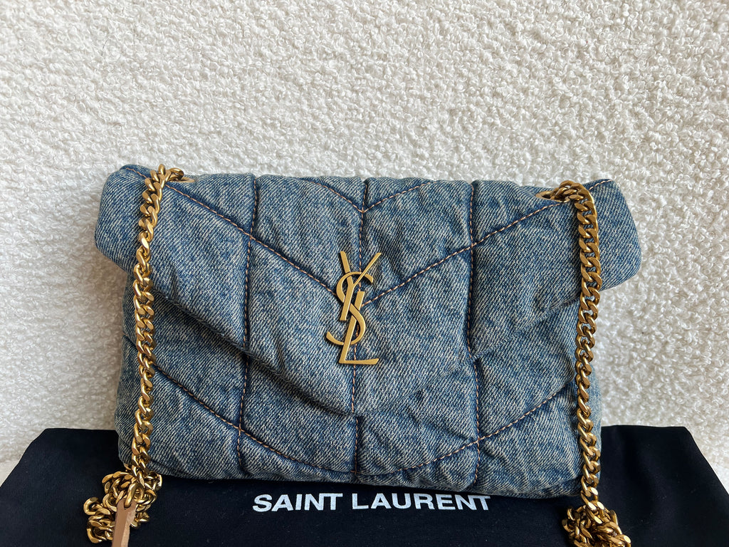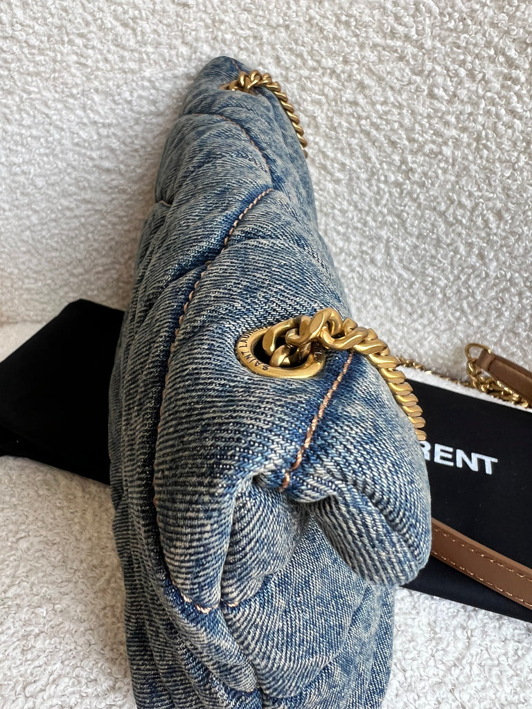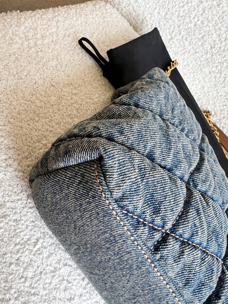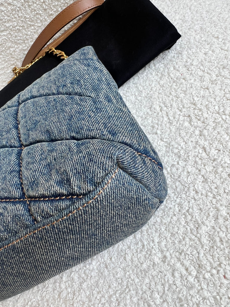 YSL Mini Puffer Bag in Quilted Rodeo Blue Denim with gold toned hardware. This satchel style puffer bag is slightly slouchy and features the YSL hardware and has flap and magnetic snap closure. The quilted denim is chic yet casual and is an ideal size for day to day or weekend wear. Can be worn over shoulder or cross body using the chain strap. This versatile style can be worn with both casual and glam outfits.