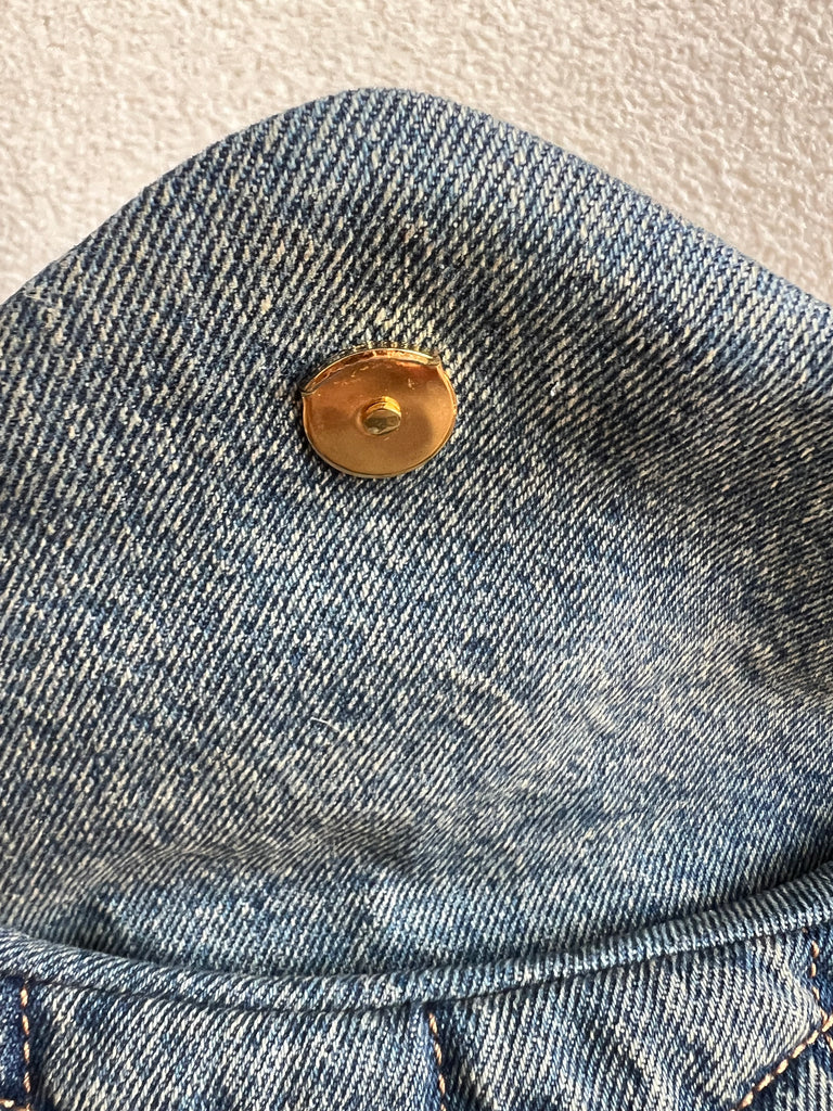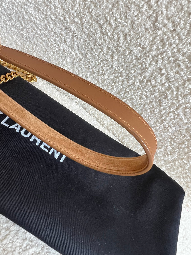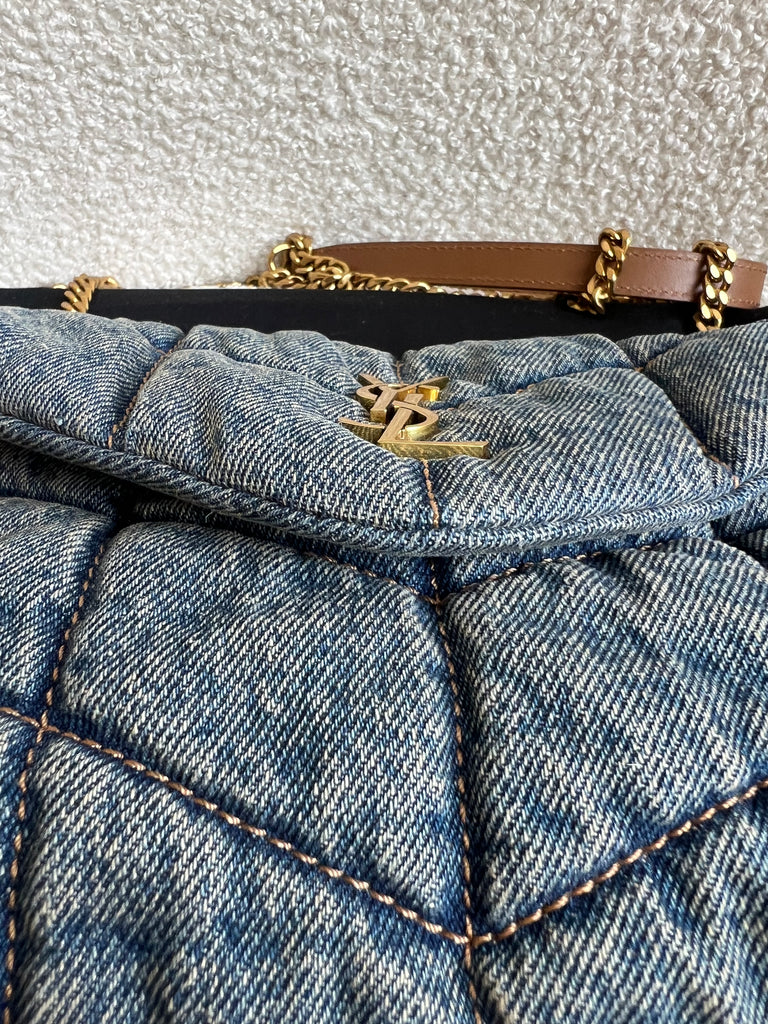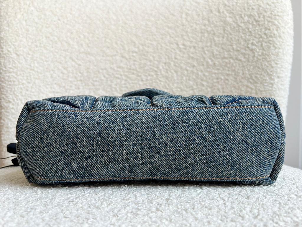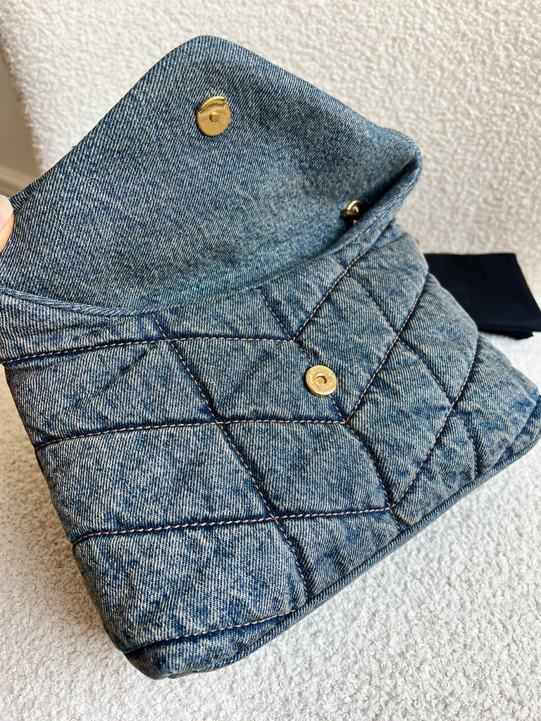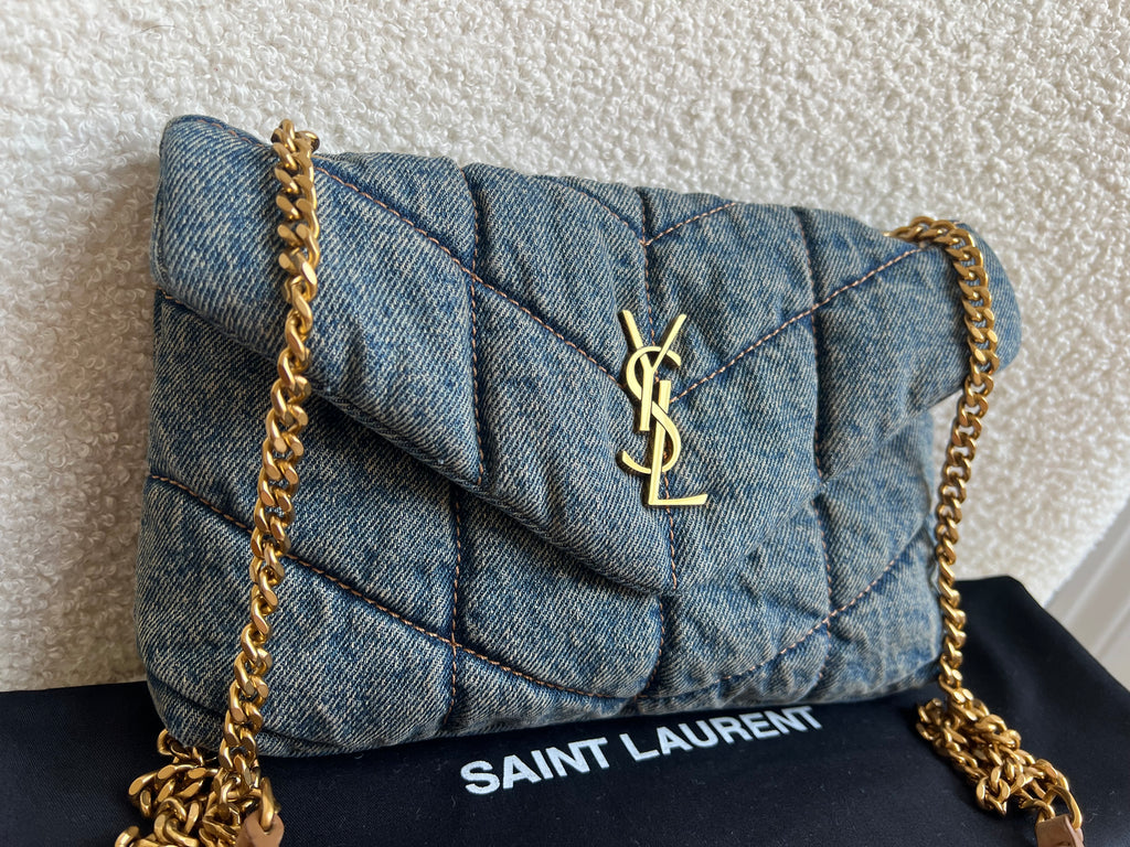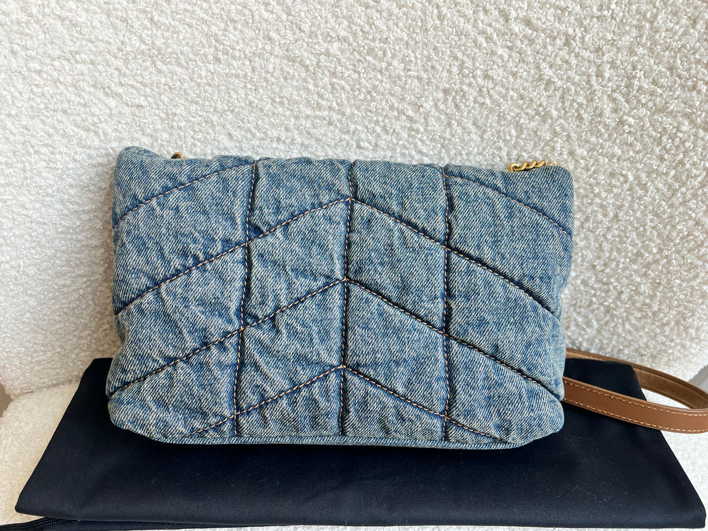 YSL Mini Puffer Bag in Quilted Rodeo Blue Denim with gold toned hardware. This satchel style puffer bag is slightly slouchy and features the YSL hardware and has flap and magnetic snap closure. The quilted denim is chic yet casual and is an ideal size for day to day or weekend wear. Can be worn over shoulder or cross body using the chain strap. This versatile style can be worn with both casual and glam outfits.