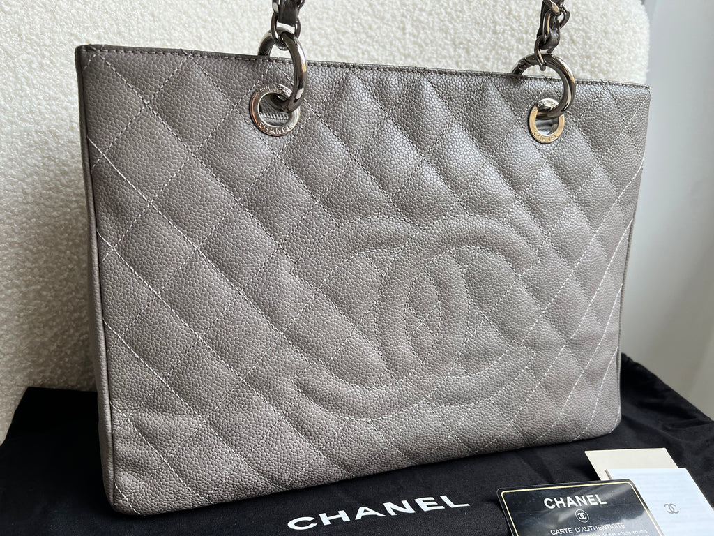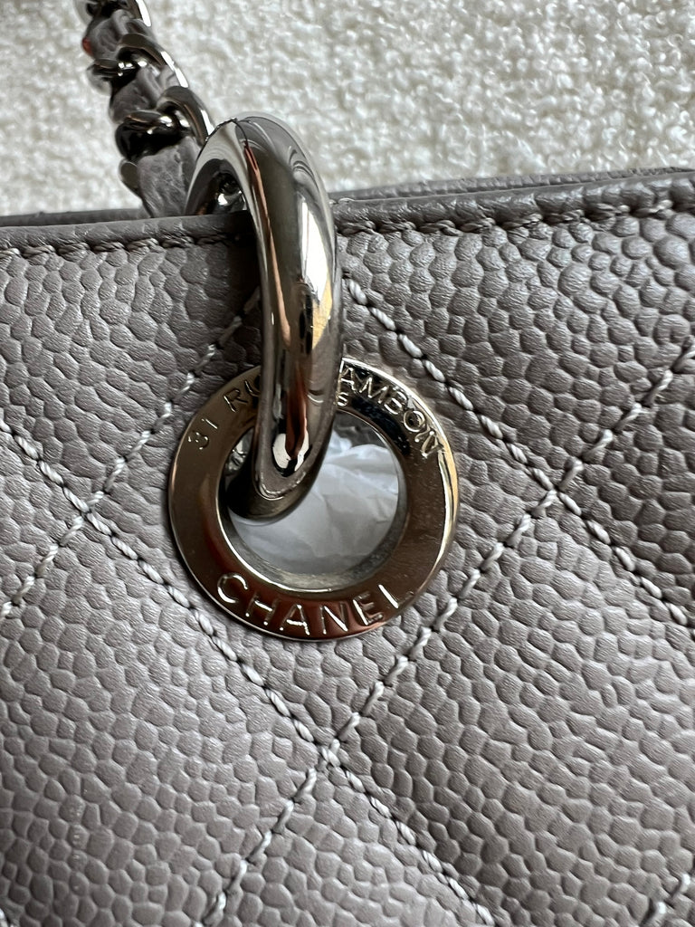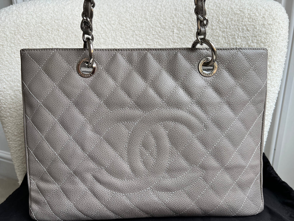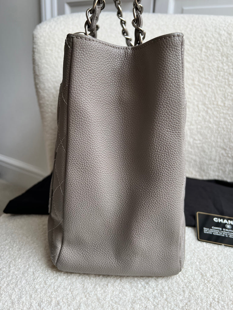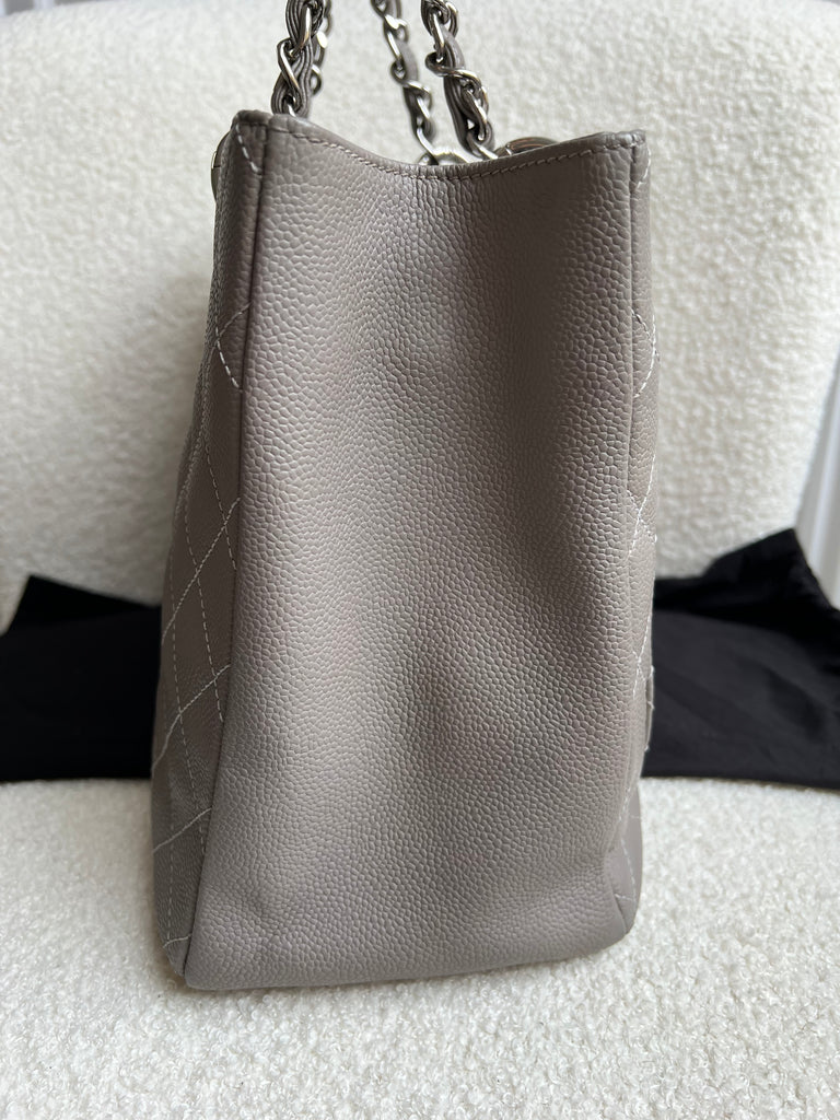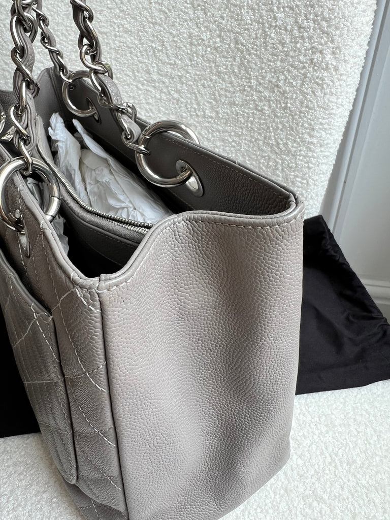 Chanel Grand Shopper Tote (GST) in Grey Caviar Leather with Ruthenium hardware. This very popular chain tote is sadly now discontinued and only available to buy preloved. Great opportunity to own a practical, iconic and sophisticated Chanel bag without the same price tag as the classic flap styles. Perfect for day or evening use and the caviar leather is very resilient and durable. Can be carried in the crook of the arm or over shoulder using the chain straps. The grey colour is rare and highly sought after.