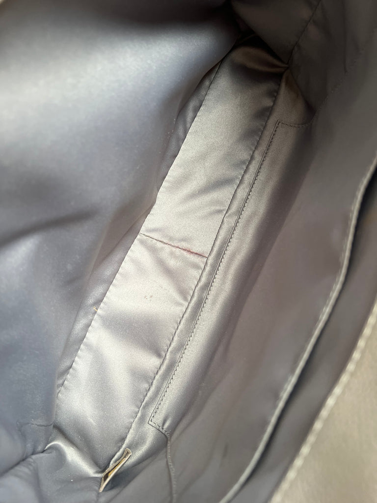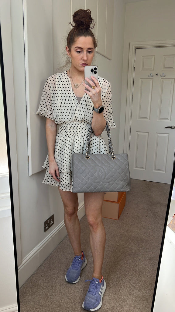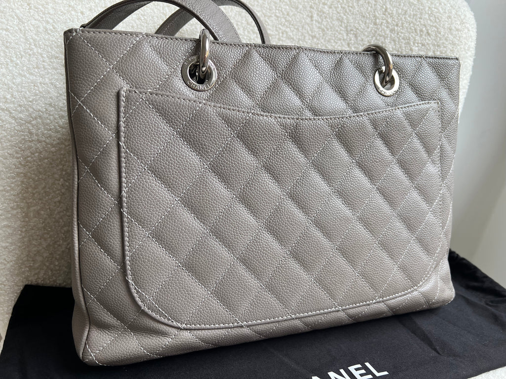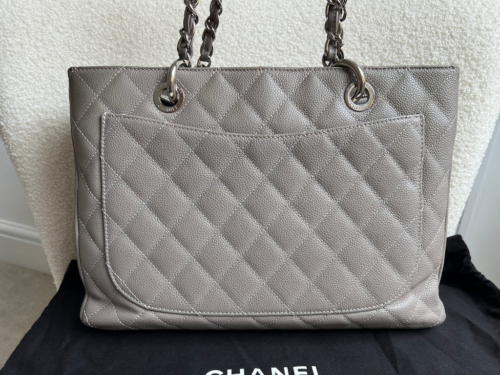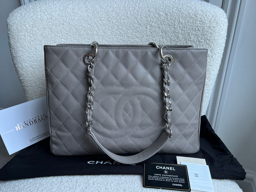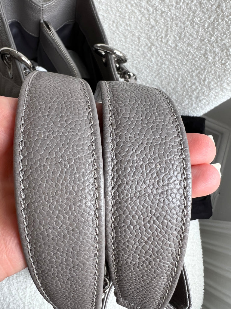 Chanel Grand Shopper Tote (GST) in Grey Caviar Leather with Ruthenium hardware. This very popular chain tote is sadly now discontinued and only available to buy preloved. Great opportunity to own a practical, iconic and sophisticated Chanel bag without the same price tag as the classic flap styles. Perfect for day or evening use and the caviar leather is very resilient and durable. Can be carried in the crook of the arm or over shoulder using the chain straps. The grey colour is rare and highly sought after.