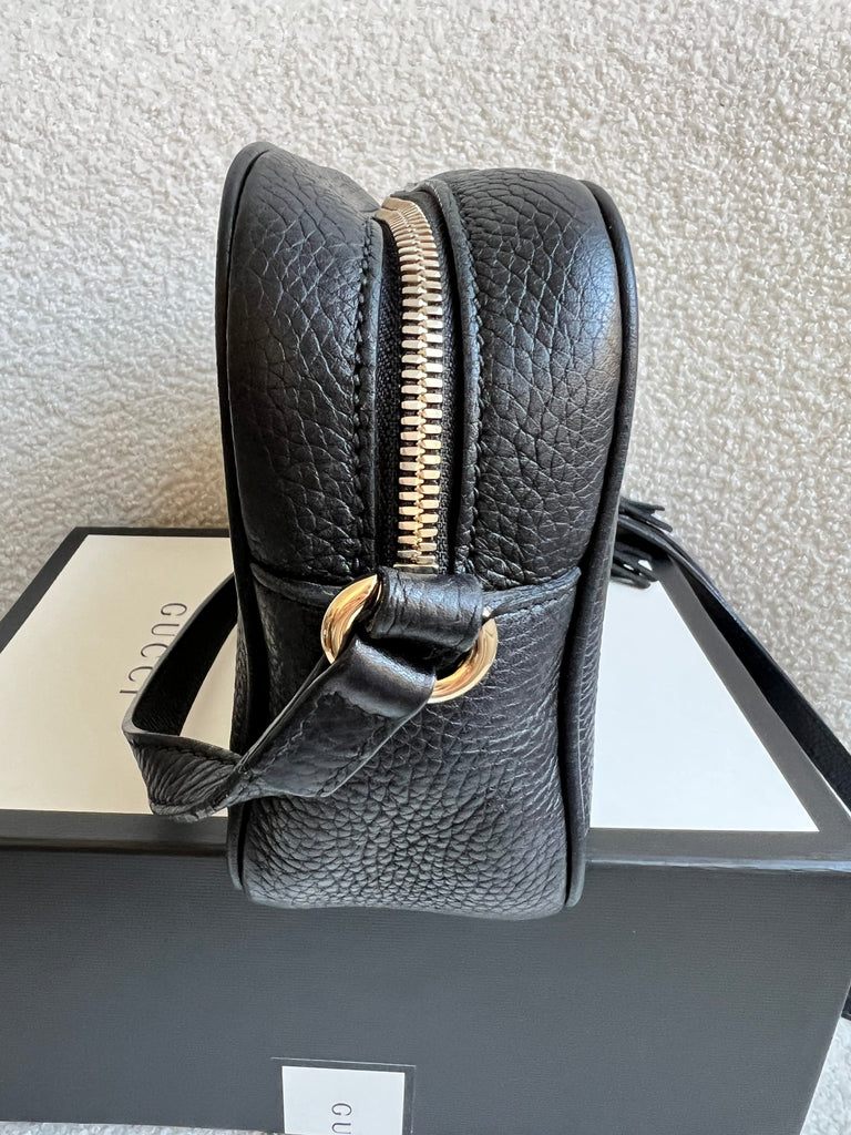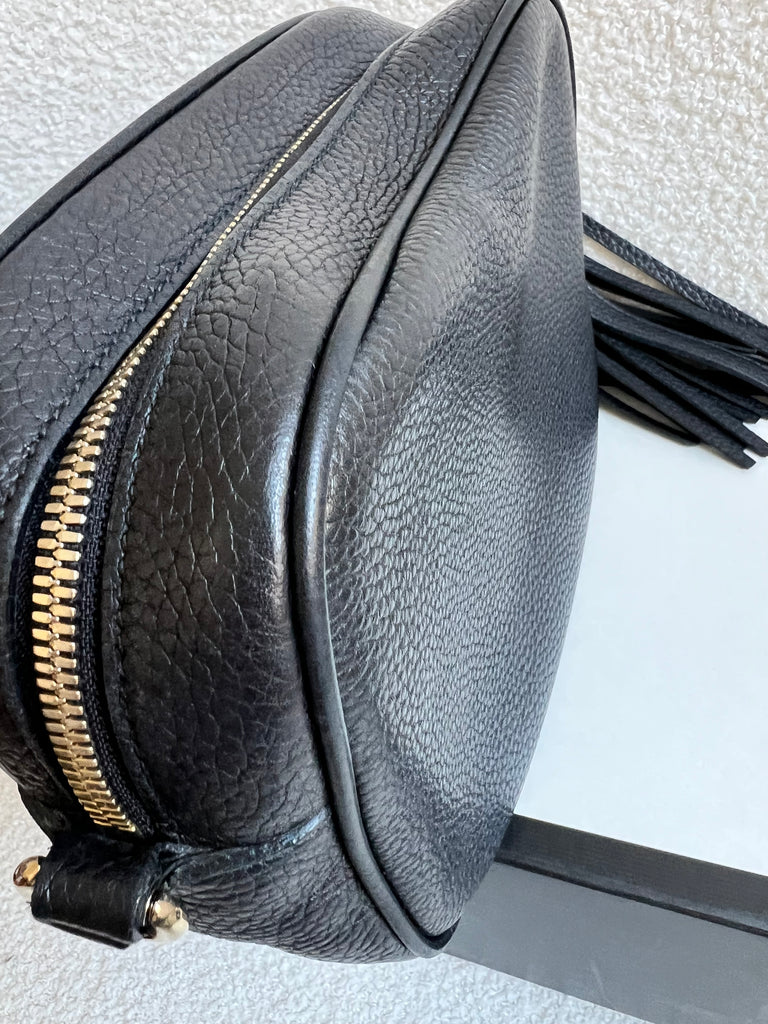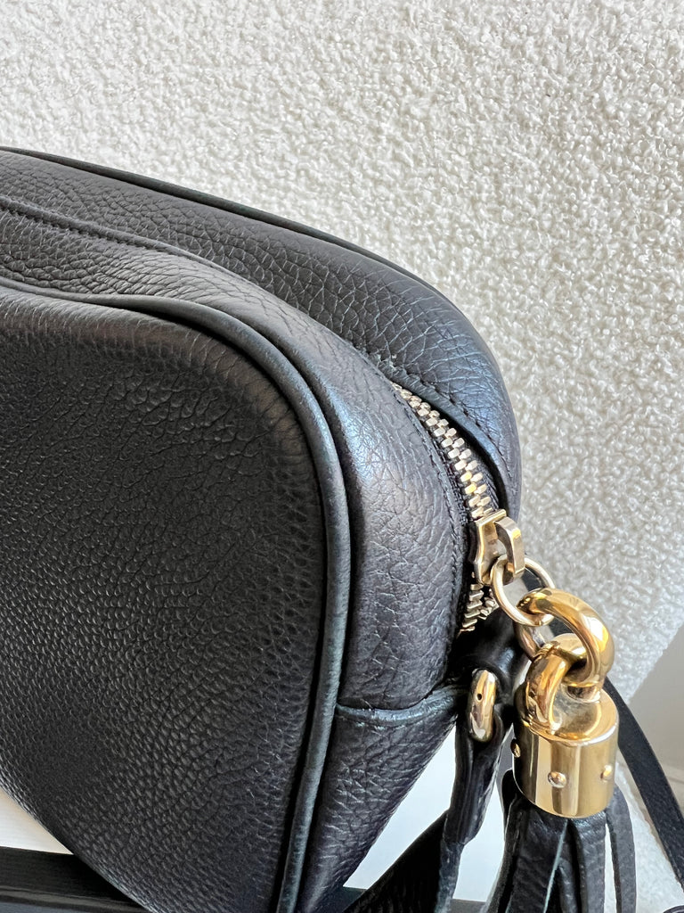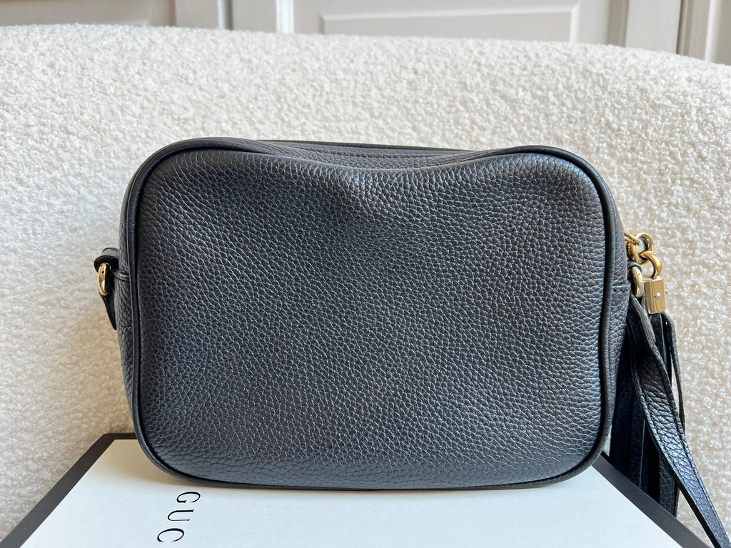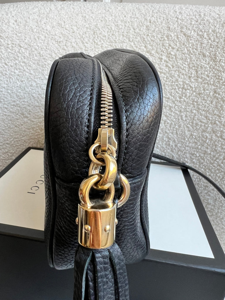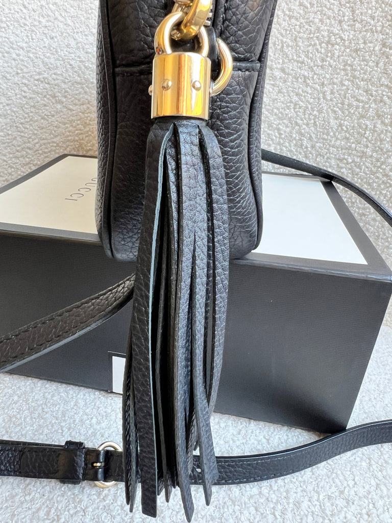 Gucci Soho Disco in Black Leather with pale gold hardware. This practical, cross body, camera style bag is compact in size but still fits a reasonable amount. Can be worn over shoulder or cross body. Gucci's most popular style and goes with any outfit, dressed up or down.