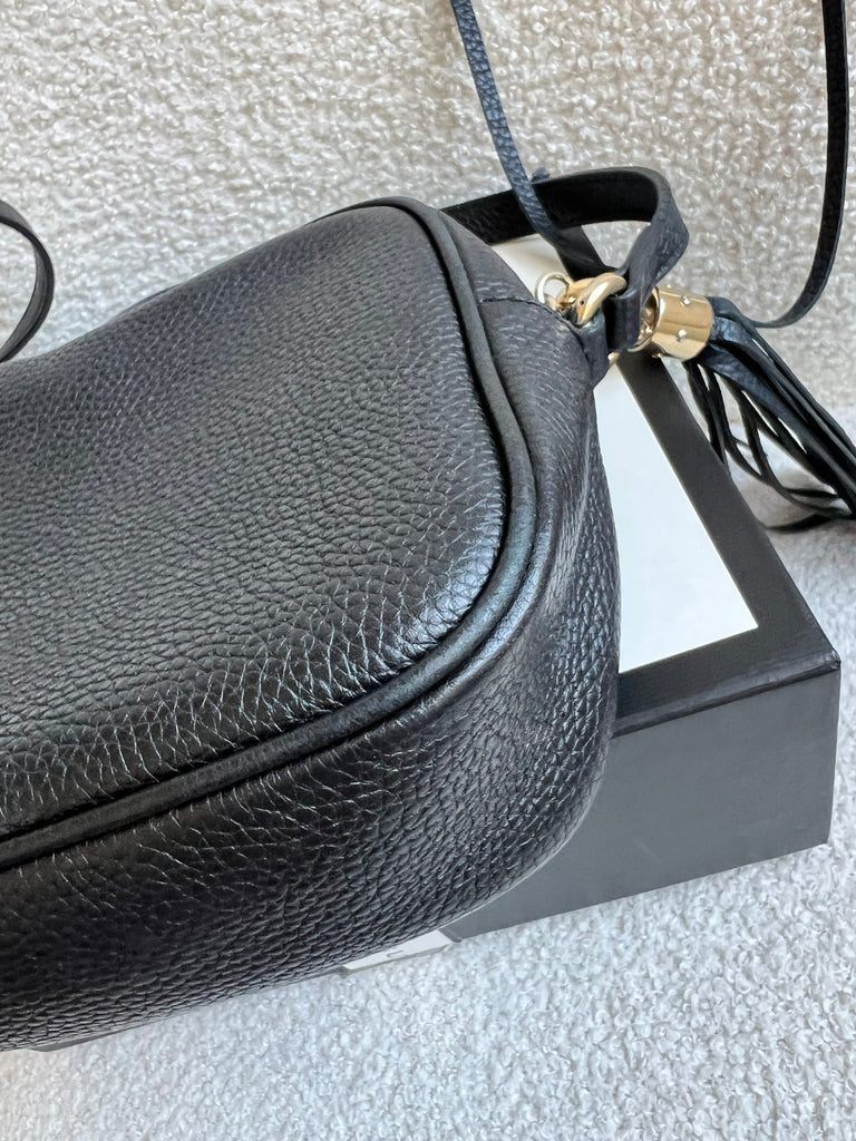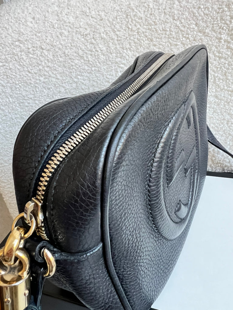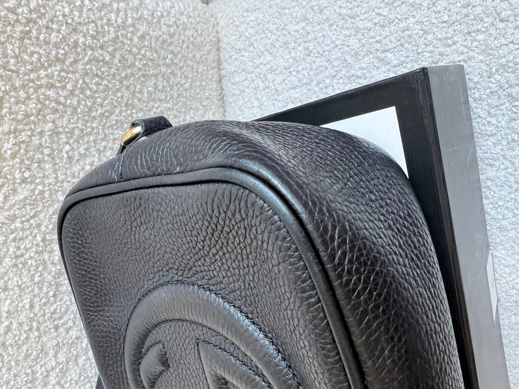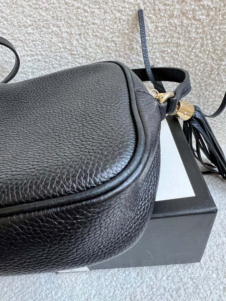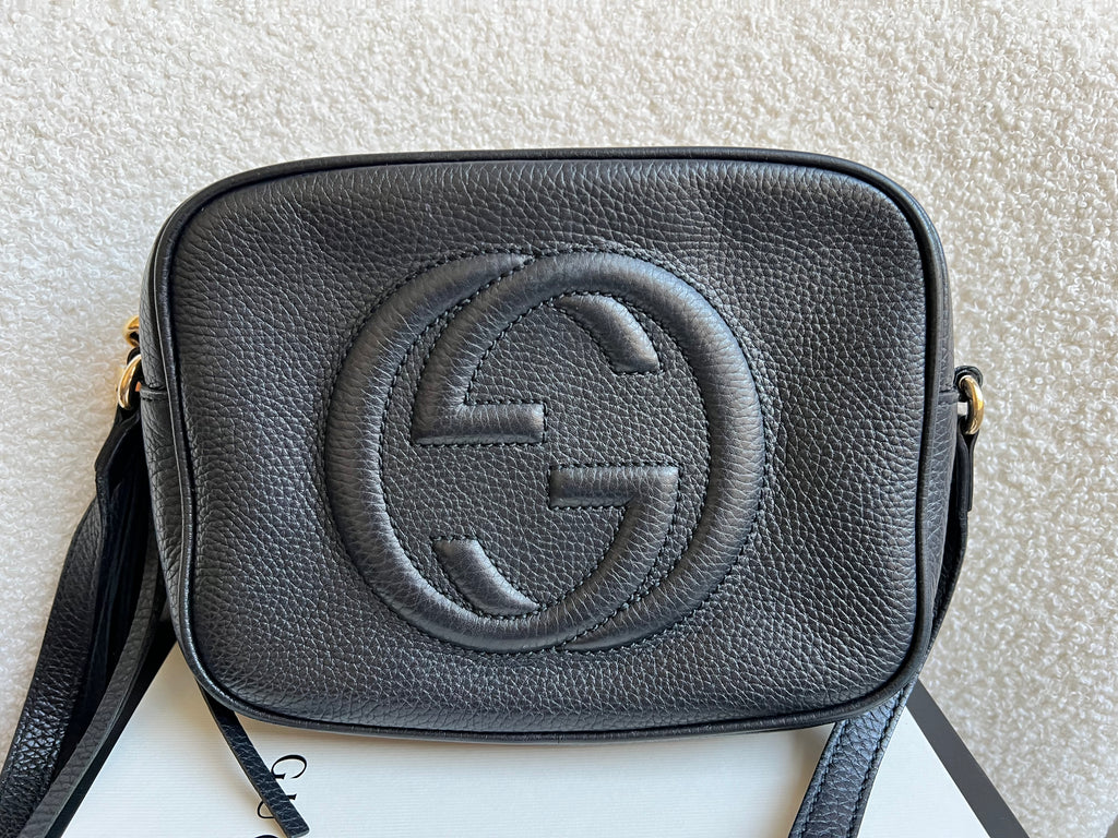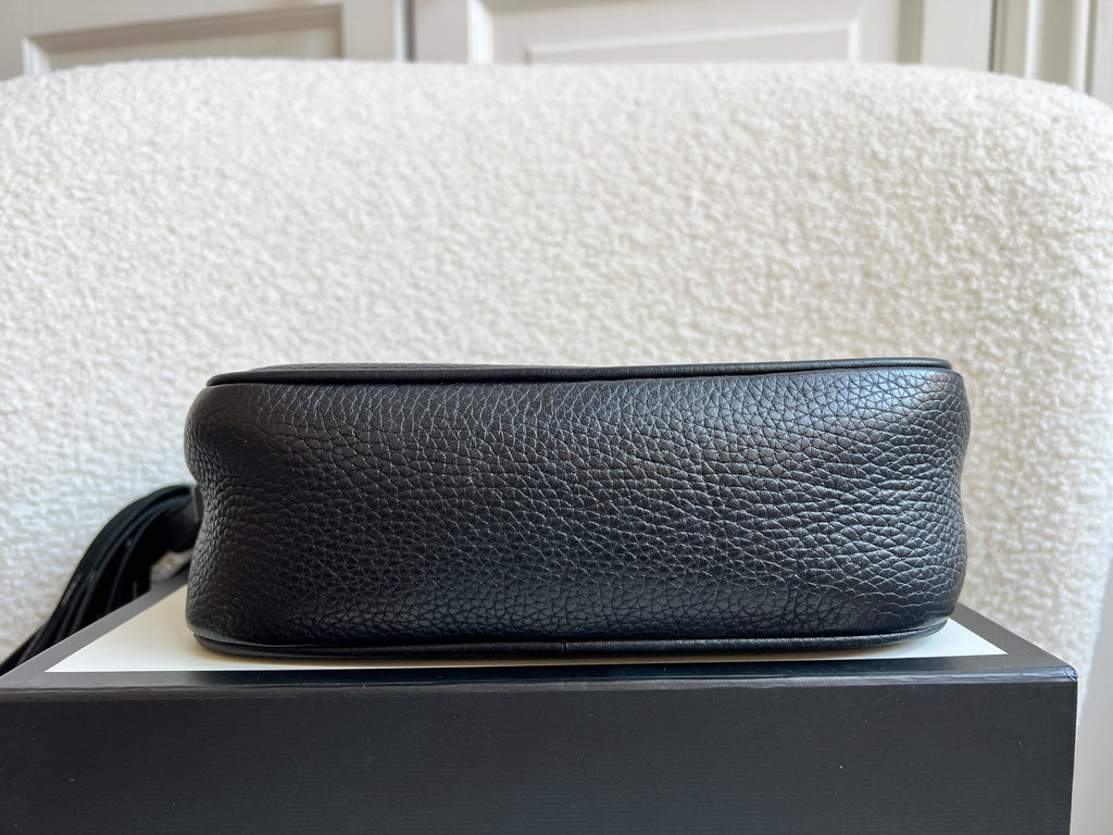 Gucci Soho Disco in Black Leather with pale gold hardware. This practical, cross body, camera style bag is compact in size but still fits a reasonable amount. Can be worn over shoulder or cross body. Gucci's most popular style and goes with any outfit, dressed up or down.