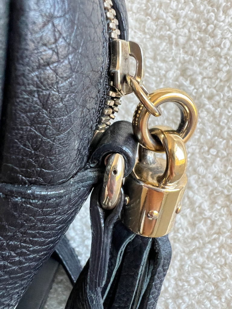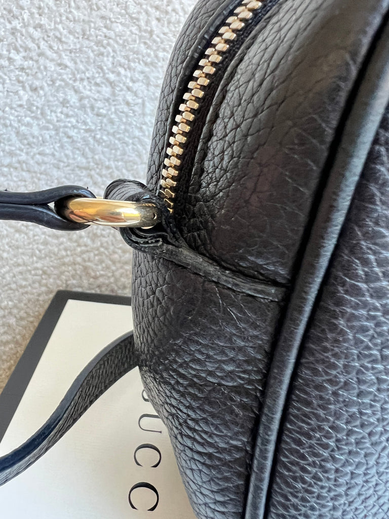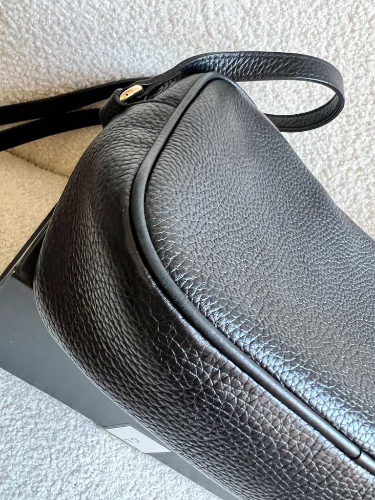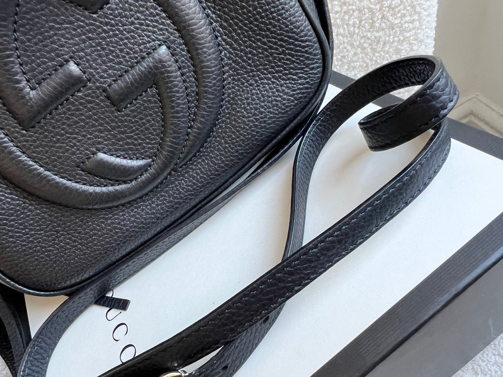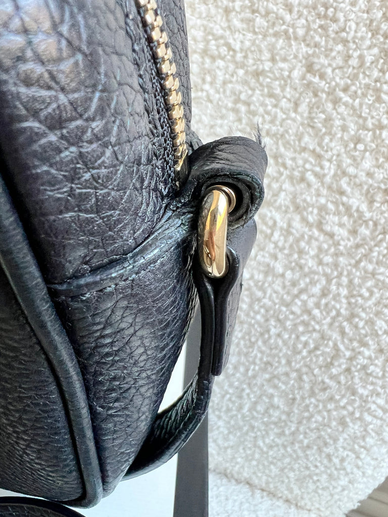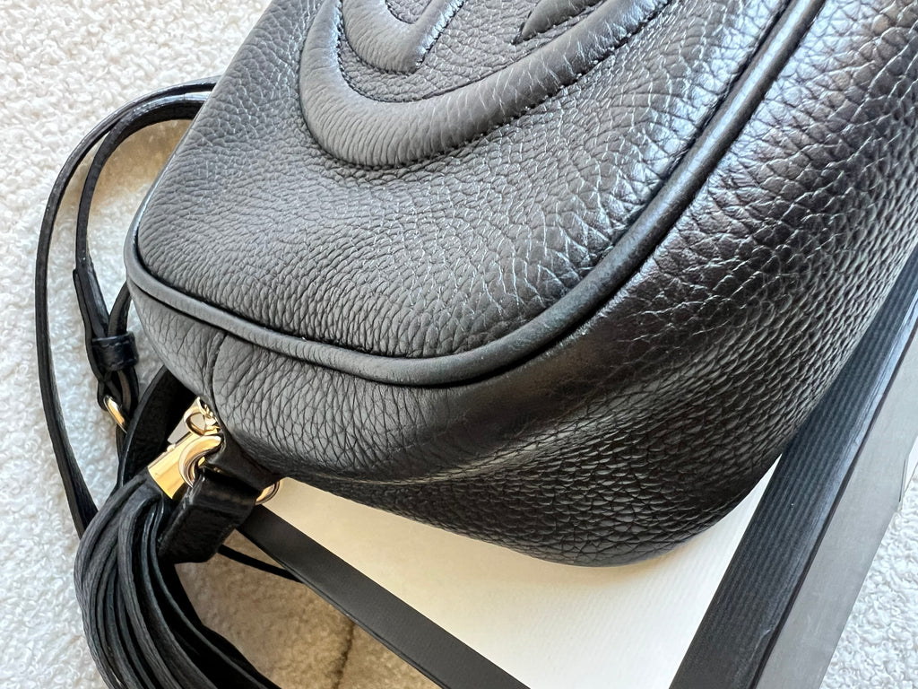 Gucci Soho Disco in Black Leather with pale gold hardware. This practical, cross body, camera style bag is compact in size but still fits a reasonable amount. Can be worn over shoulder or cross body. Gucci's most popular style and goes with any outfit, dressed up or down.