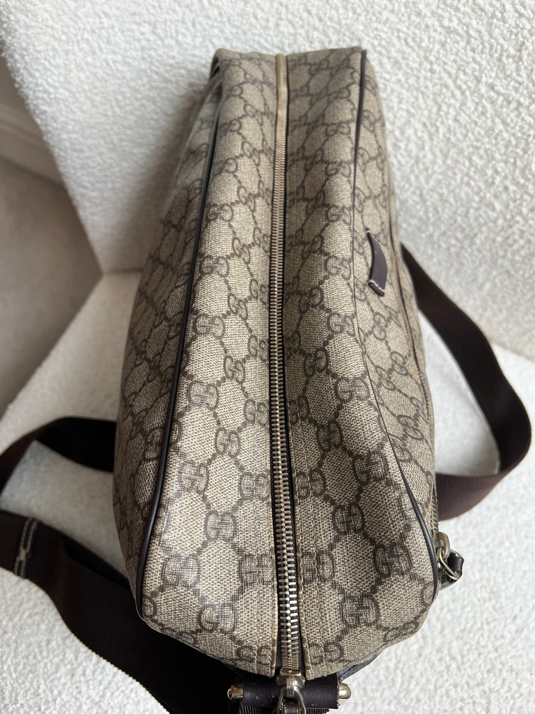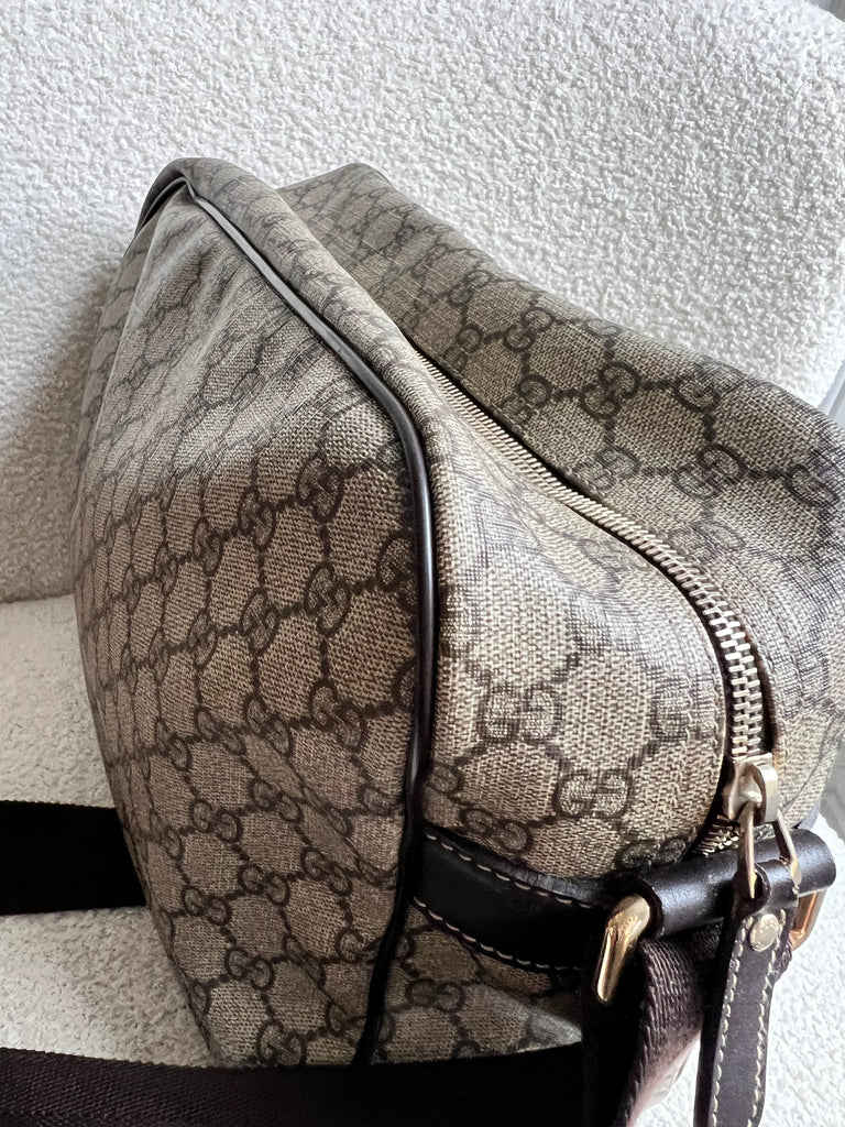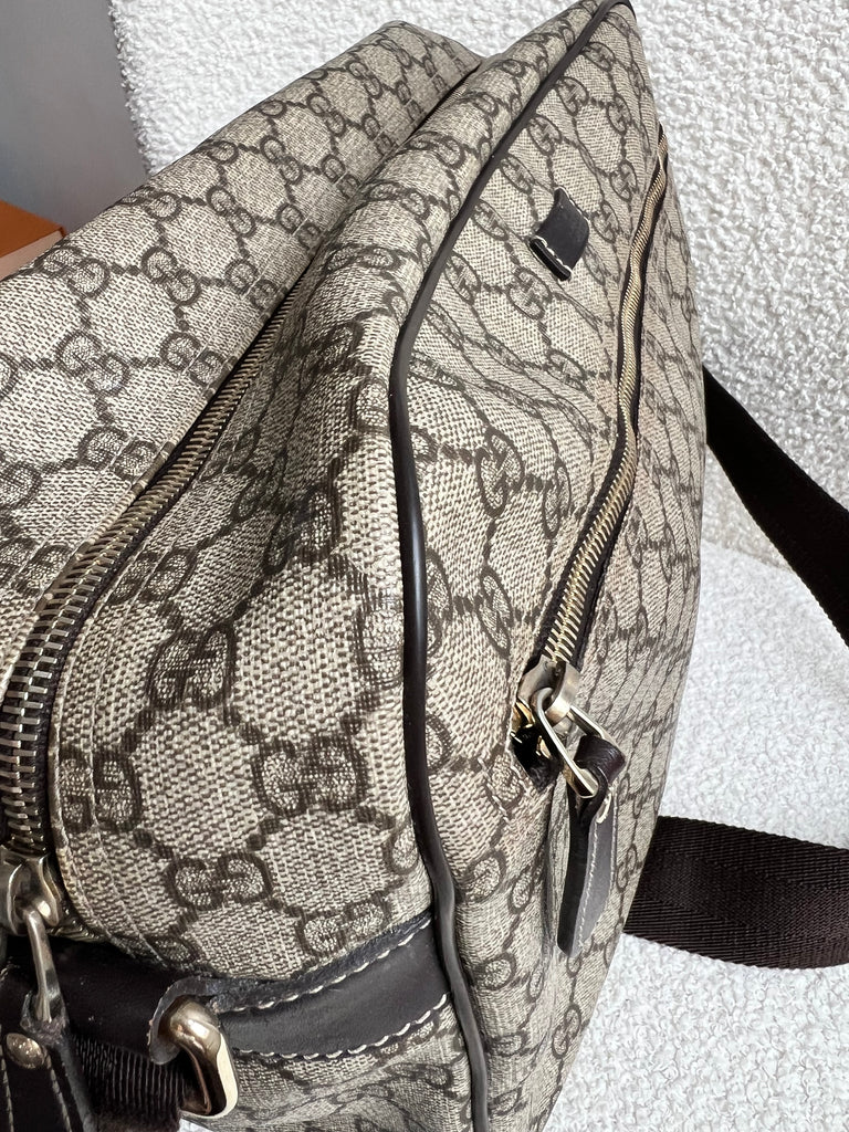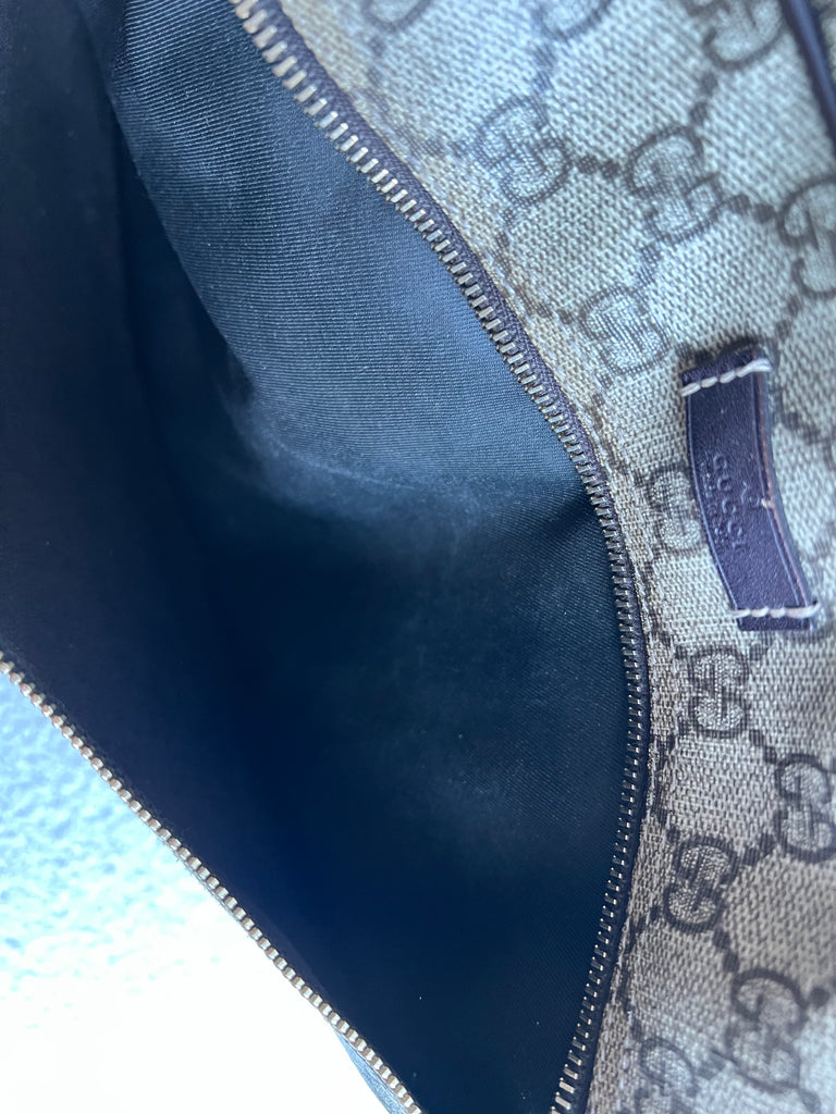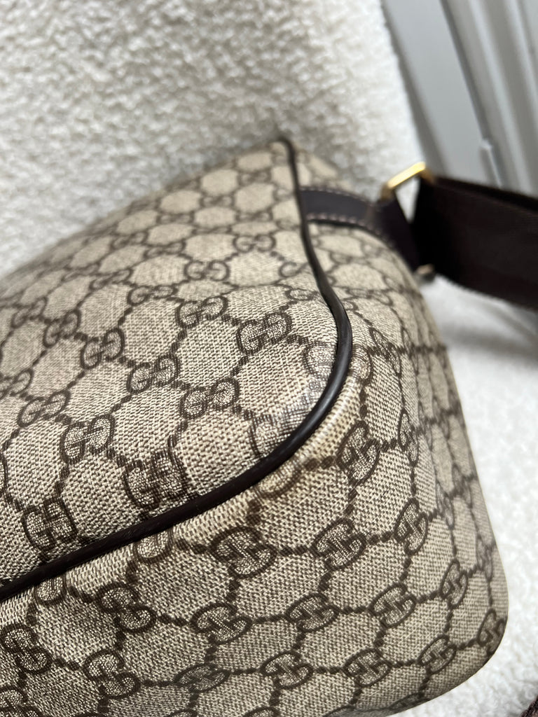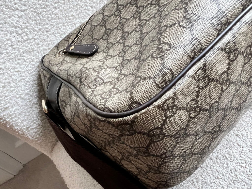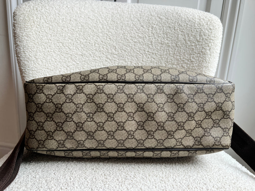 Gucci Supreme Shoulder Bag in GG Canvas with dall brown Leather trim. This large sized shoulder bag is unisex and is somewhat slouchy in shape. Featuring canvas strap with flap closure and zipper closure. Can be worn over shoulder or cross body.