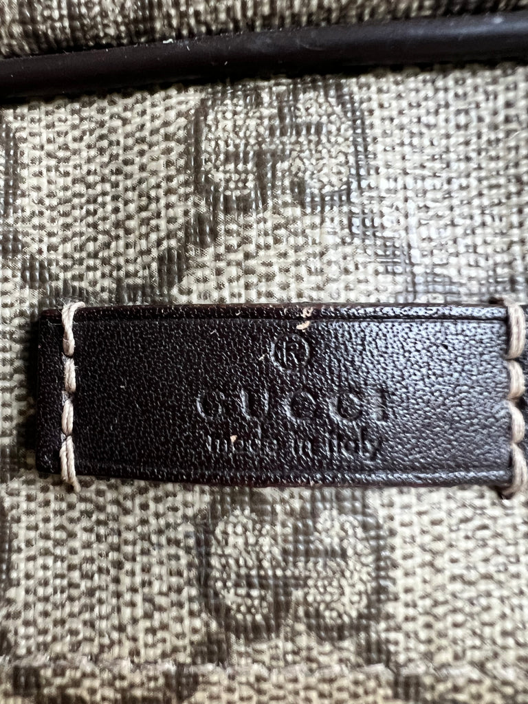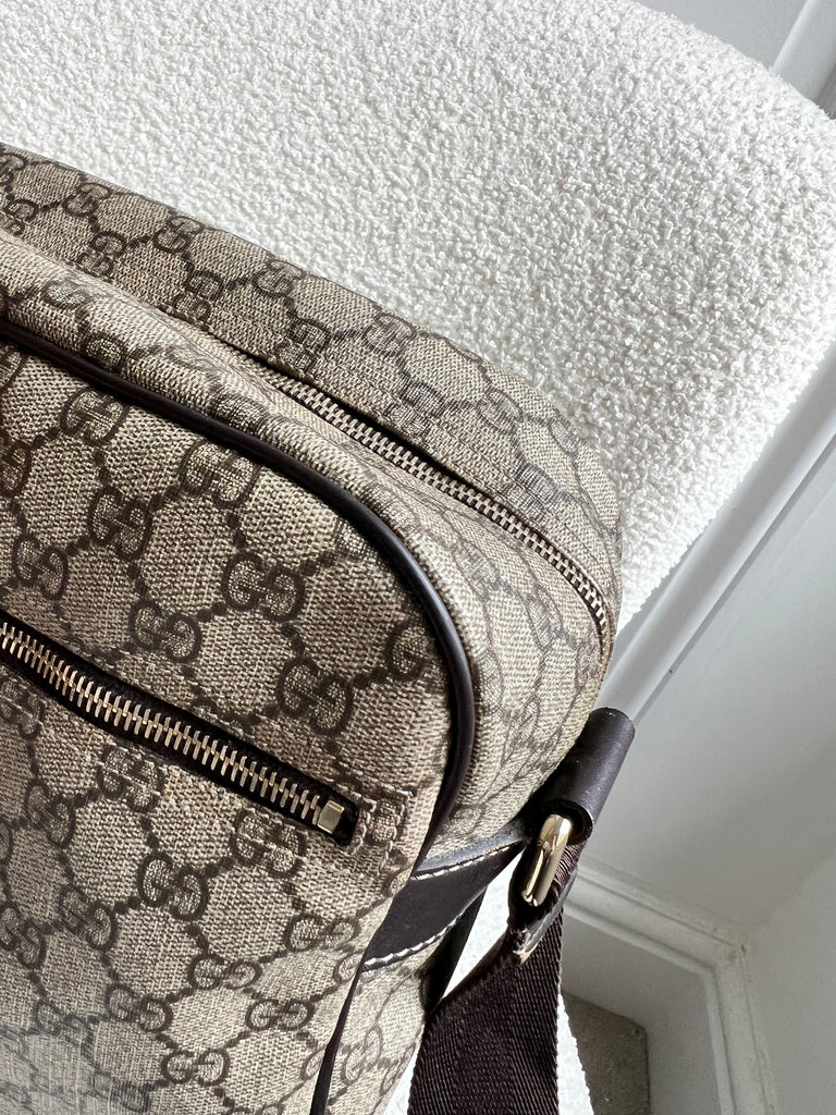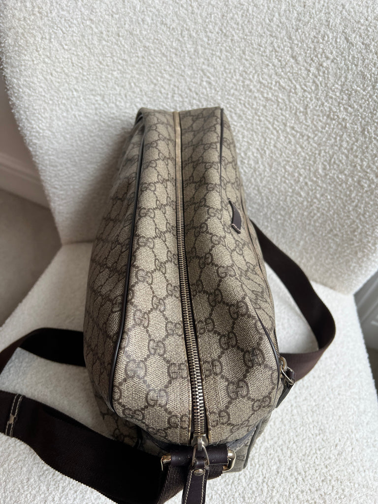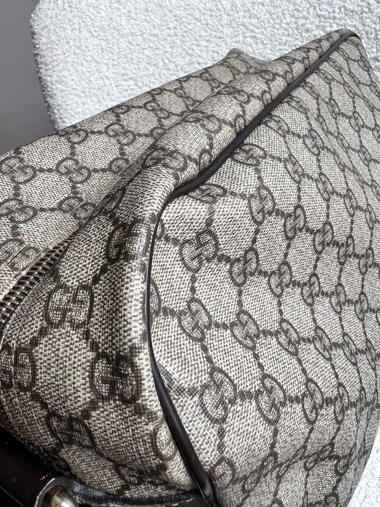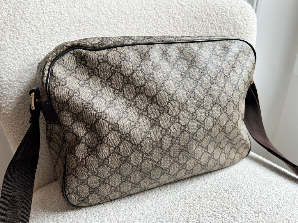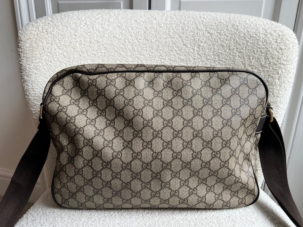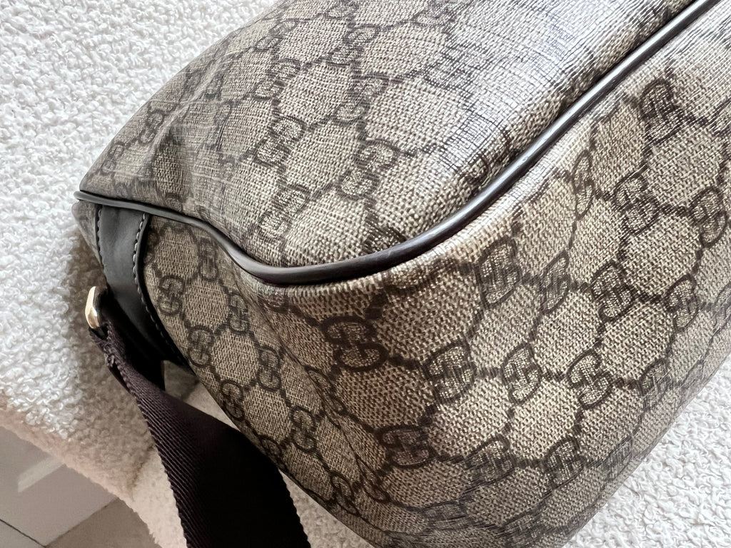 Gucci Supreme Shoulder Bag in GG Canvas with dall brown Leather trim. This large sized shoulder bag is unisex and is somewhat slouchy in shape. Featuring canvas strap with flap closure and zipper closure. Can be worn over shoulder or cross body.