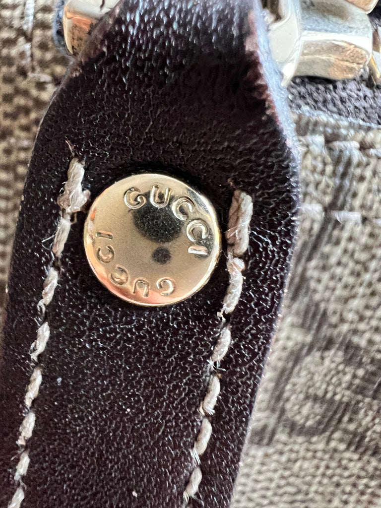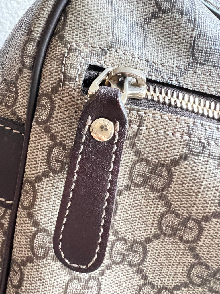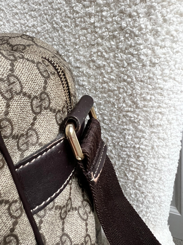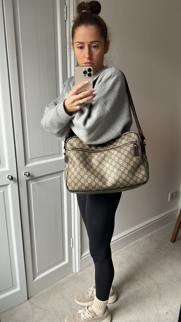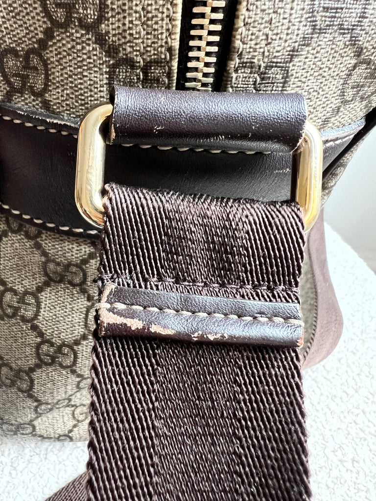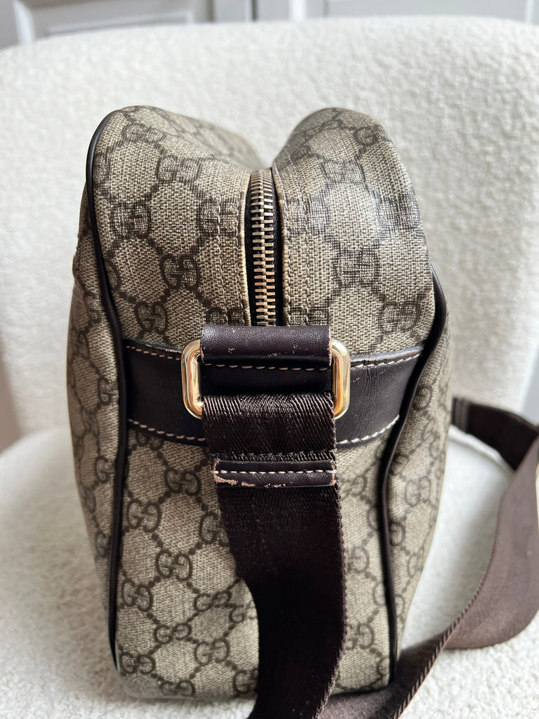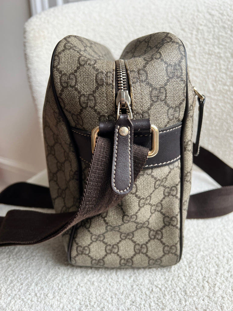 Gucci Supreme Shoulder Bag in GG Canvas with dall brown Leather trim. This large sized shoulder bag is unisex and is somewhat slouchy in shape. Featuring canvas strap with flap closure and zipper closure. Can be worn over shoulder or cross body.