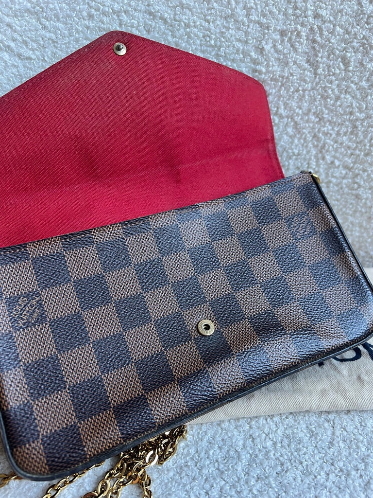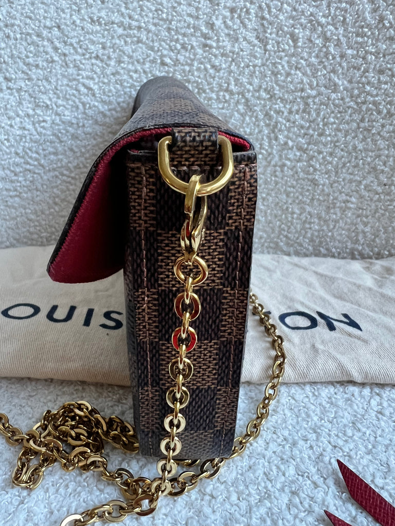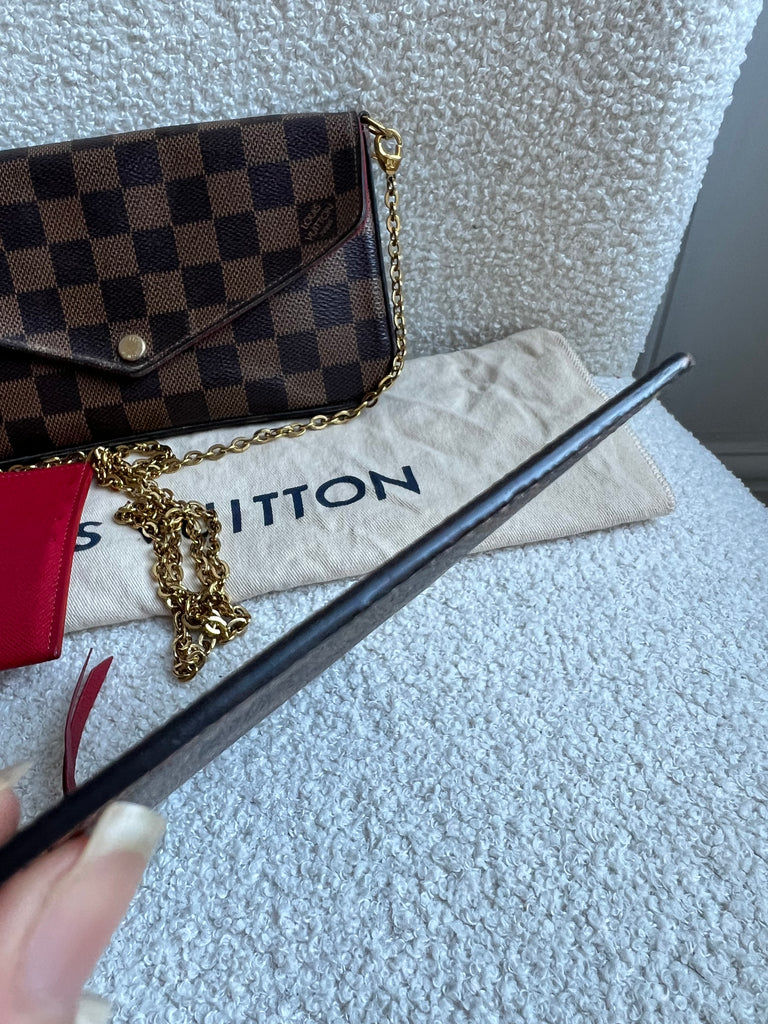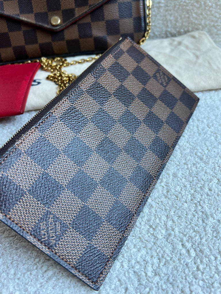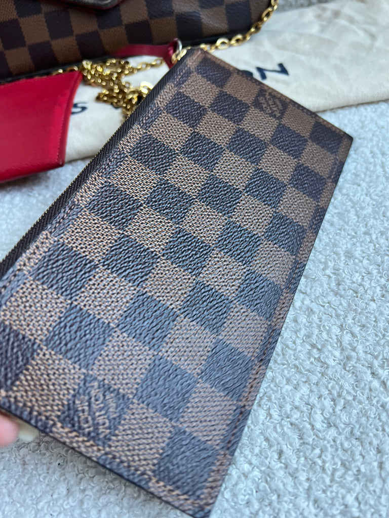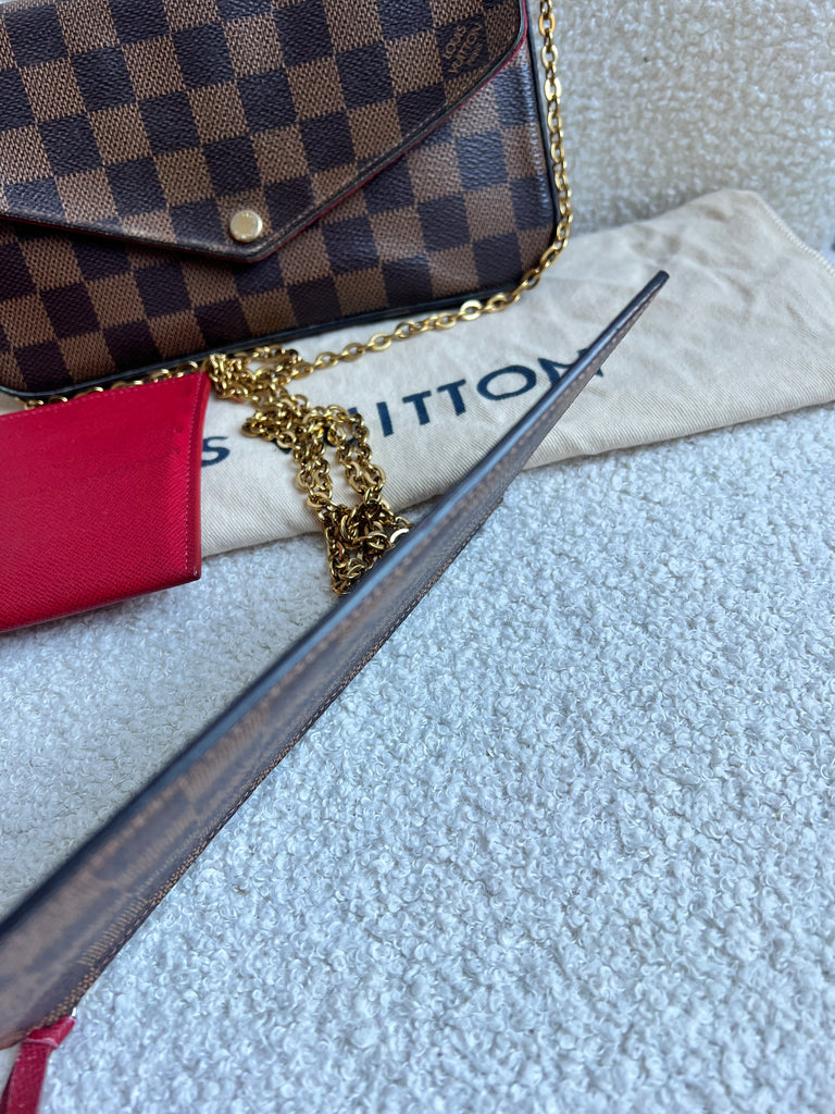 Louis Vuitton Felicie Pochette in Damier Ebene canvas with red lining. This stylish pochette is perfect to hold the essentials on a night out or evening function. Can be used for day to day wear for those who prefer smaller bags. Can be worn cross body using the removable chain or carried in hand as a clutch, or carried inside a larger bag. This highly sought after style comes with two removable inserts.