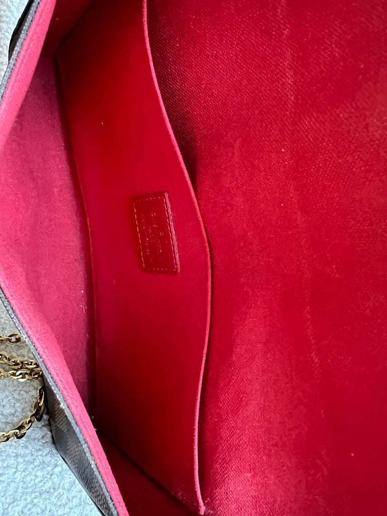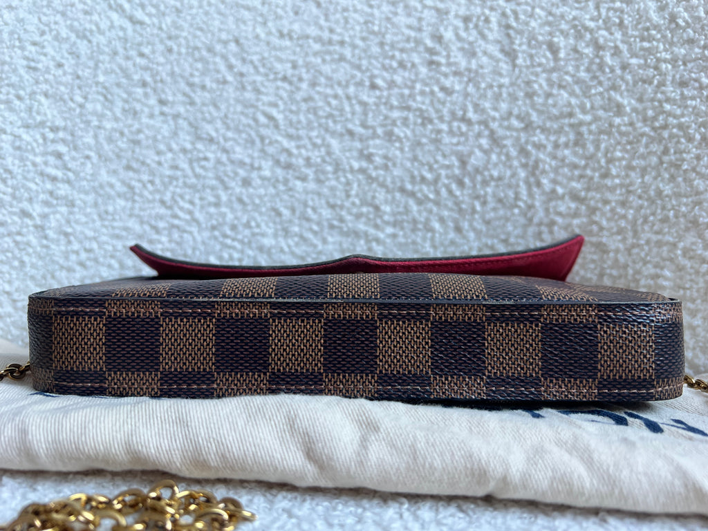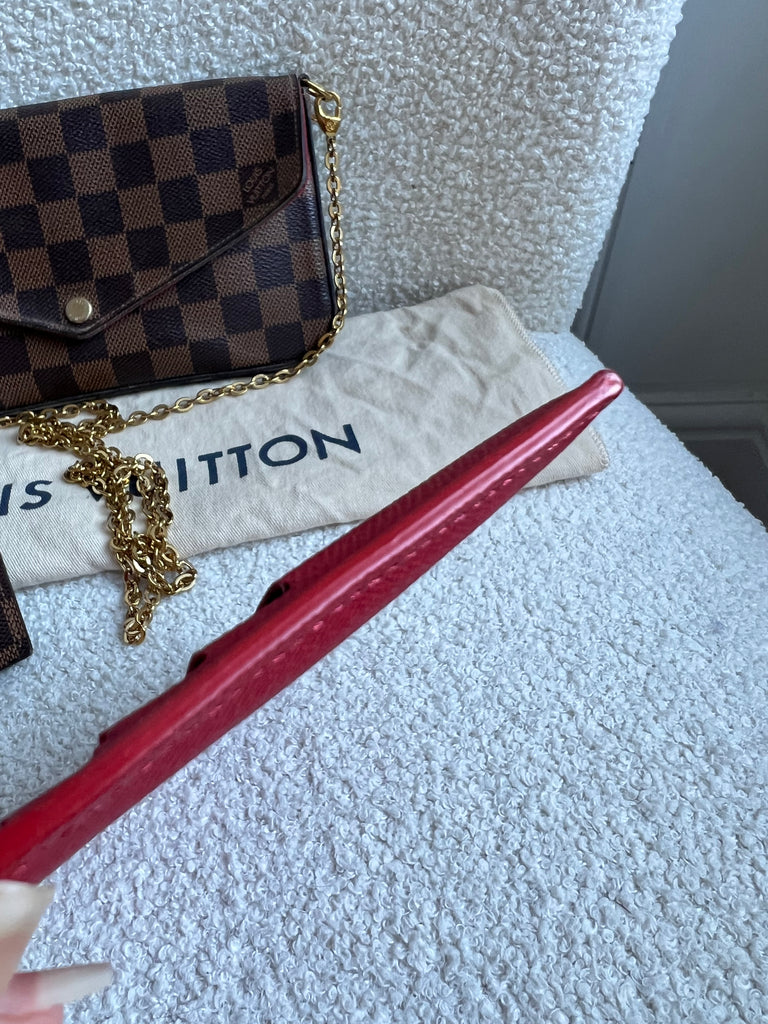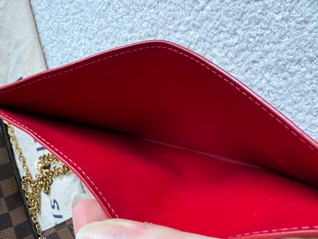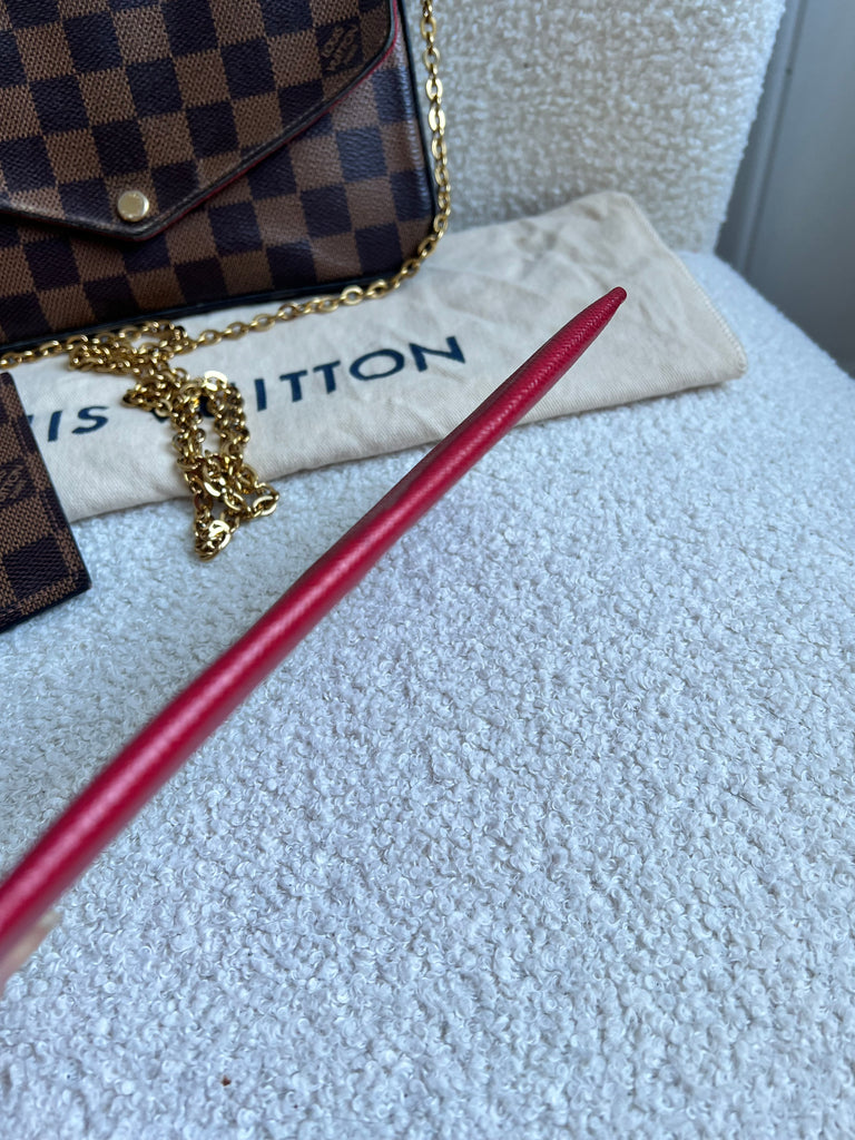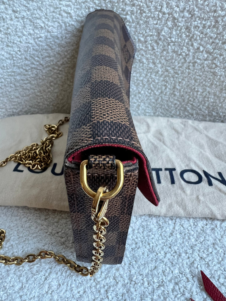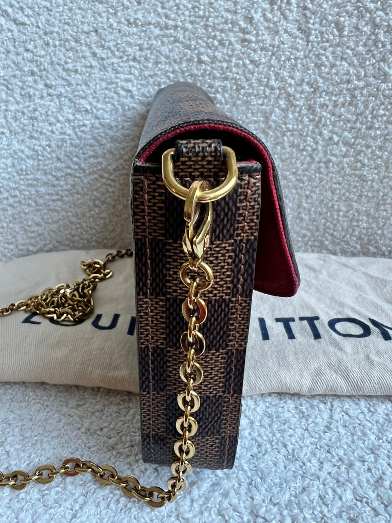 Louis Vuitton Felicie Pochette in Damier Ebene canvas with red lining. This stylish pochette is perfect to hold the essentials on a night out or evening function. Can be used for day to day wear for those who prefer smaller bags. Can be worn cross body using the removable chain or carried in hand as a clutch, or carried inside a larger bag. This highly sought after style comes with two removable inserts.