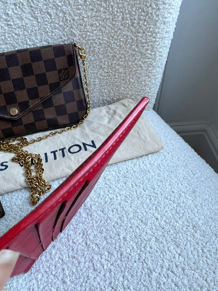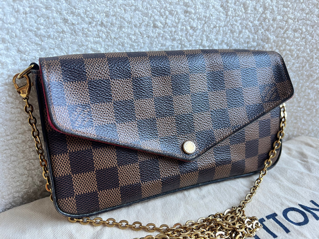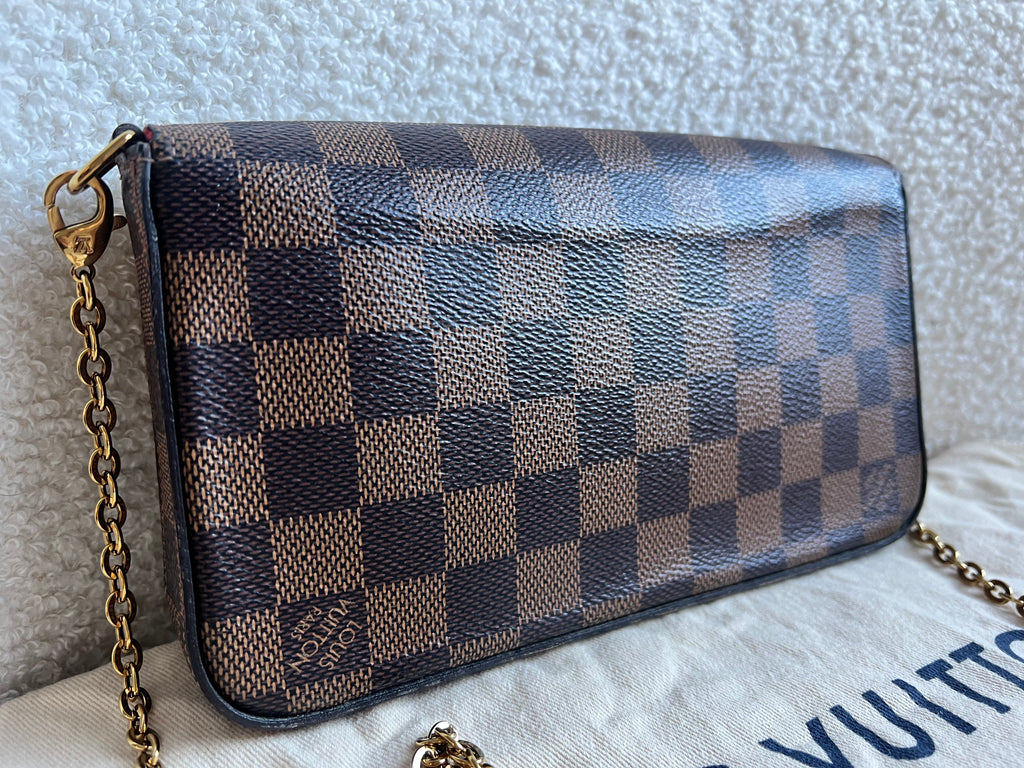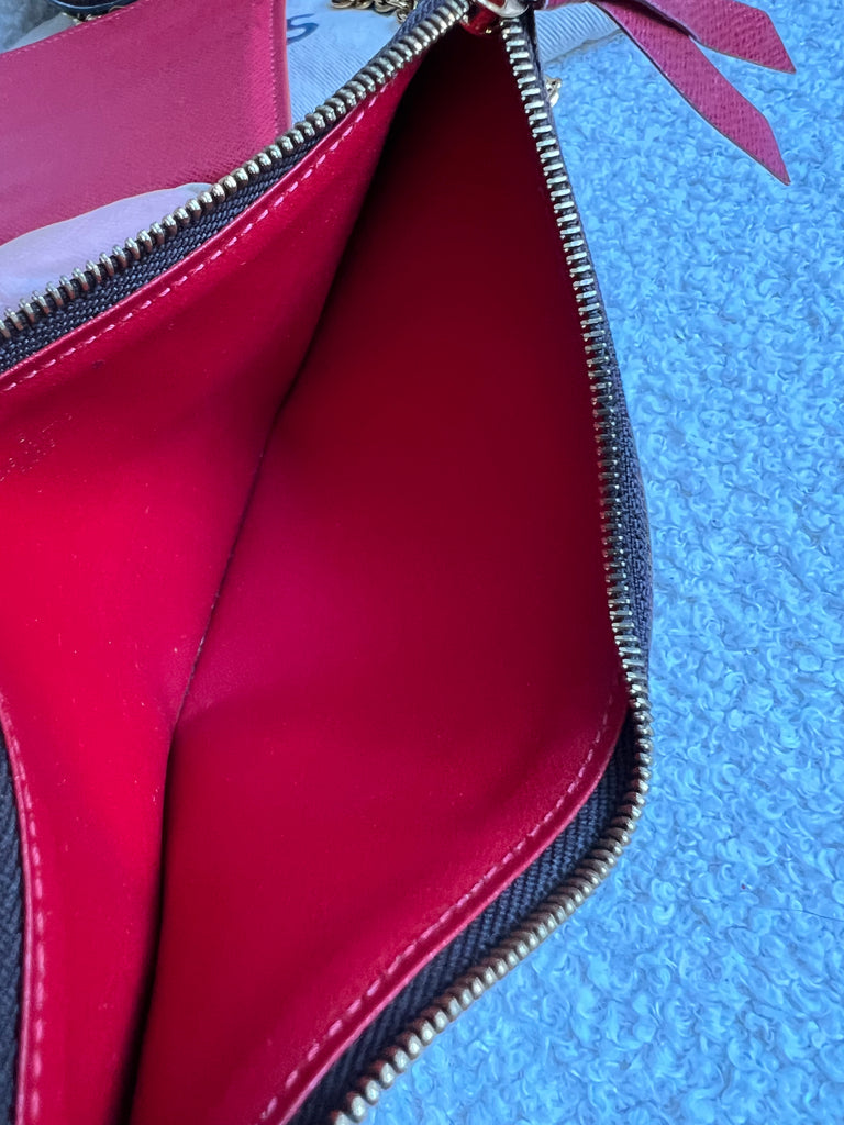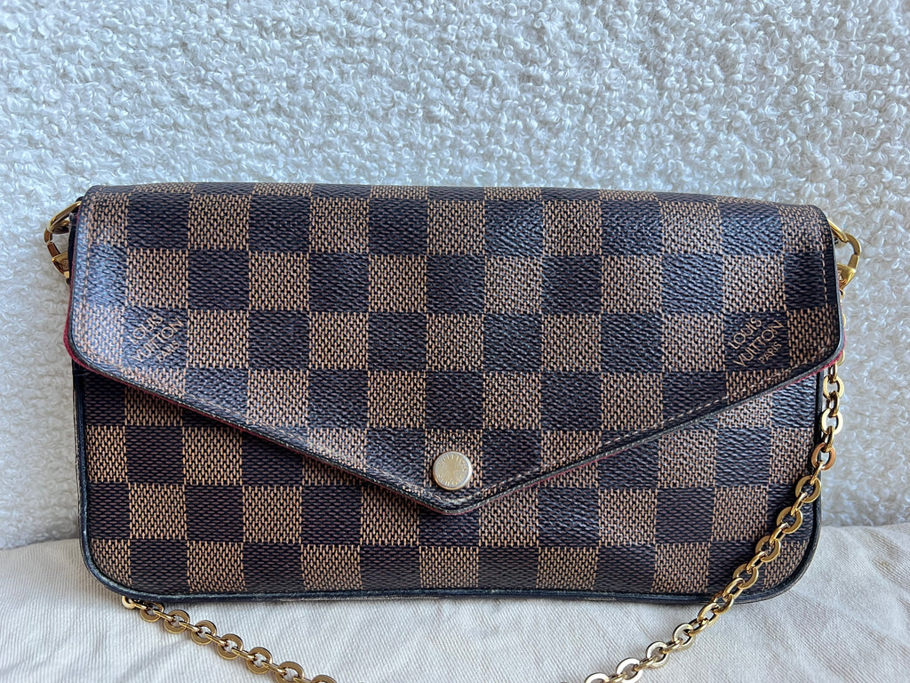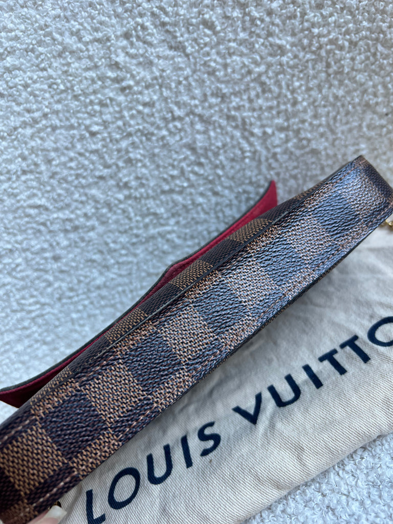 Louis Vuitton Felicie Pochette in Damier Ebene canvas with red lining. This stylish pochette is perfect to hold the essentials on a night out or evening function. Can be used for day to day wear for those who prefer smaller bags. Can be worn cross body using the removable chain or carried in hand as a clutch, or carried inside a larger bag. This highly sought after style comes with two removable inserts.