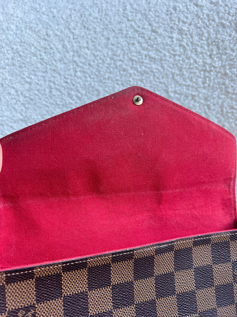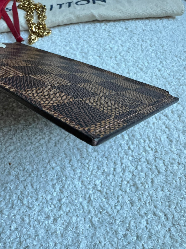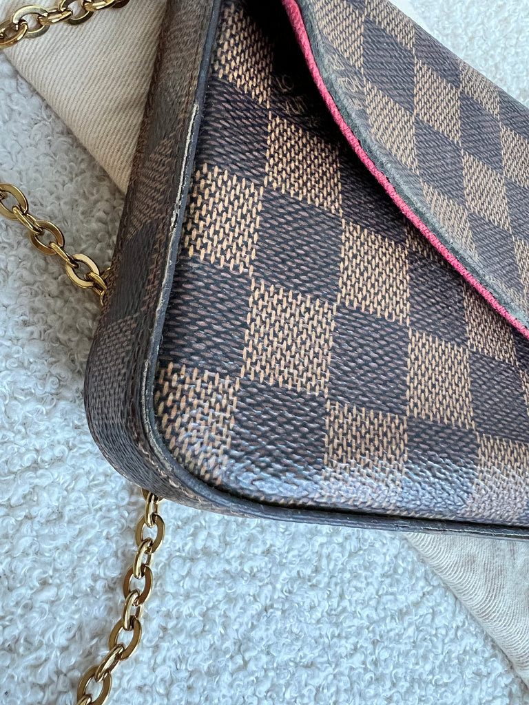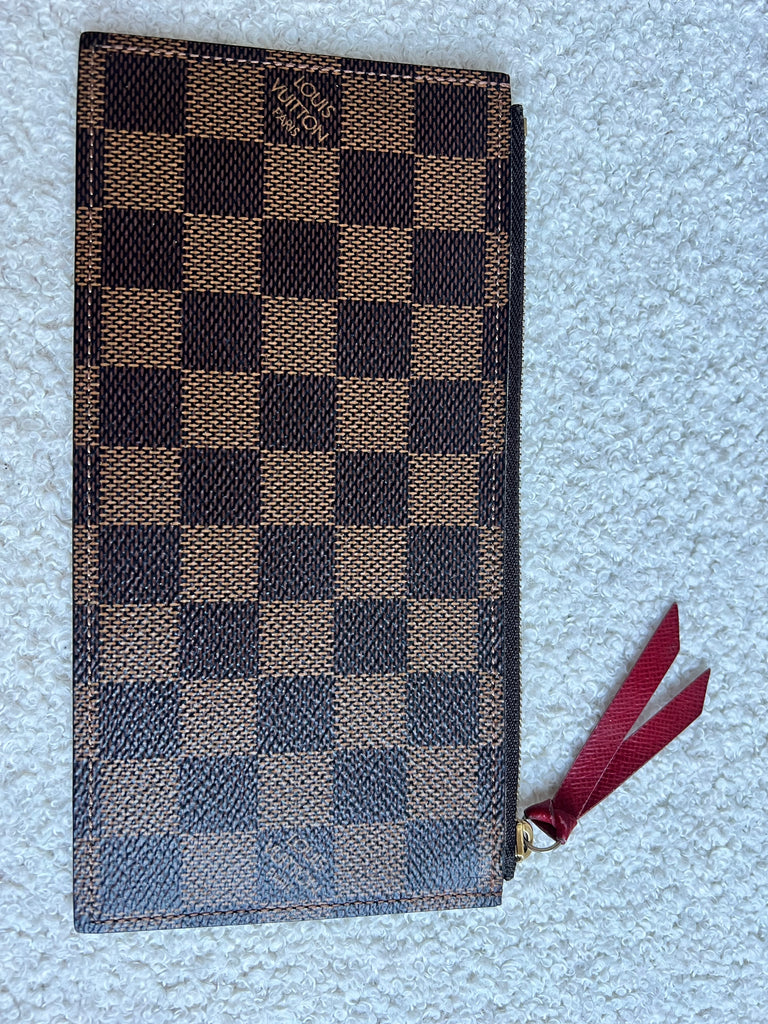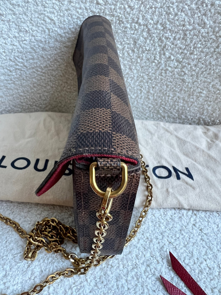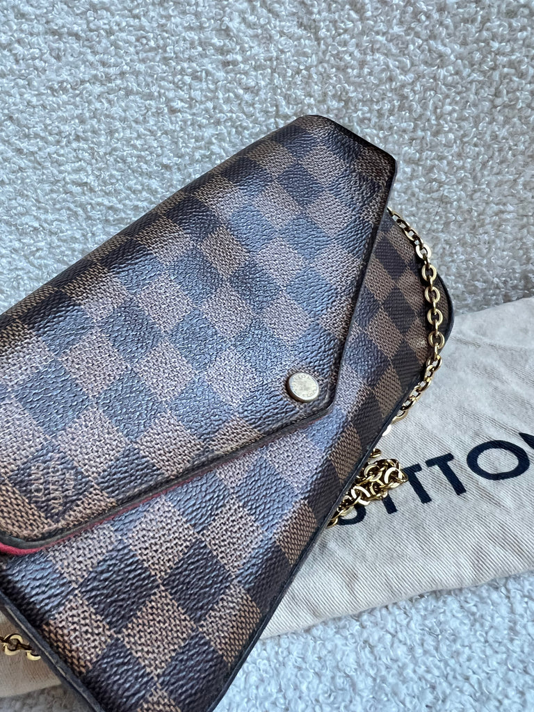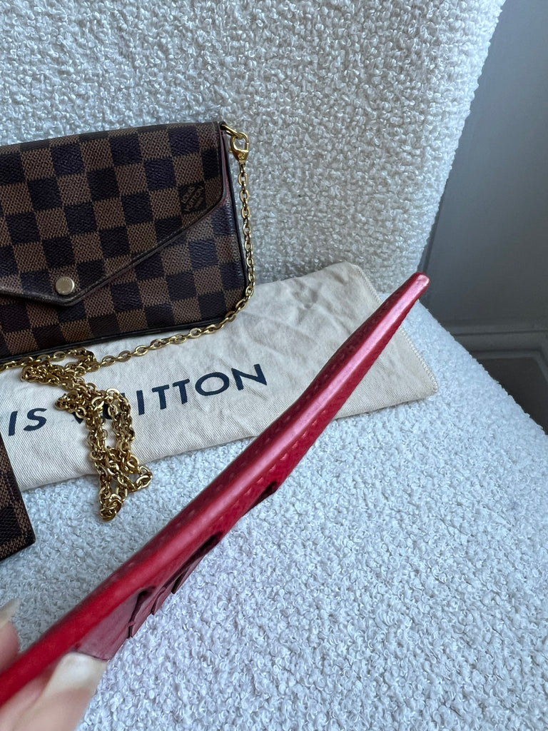 Louis Vuitton Felicie Pochette in Damier Ebene canvas with red lining. This stylish pochette is perfect to hold the essentials on a night out or evening function. Can be used for day to day wear for those who prefer smaller bags. Can be worn cross body using the removable chain or carried in hand as a clutch, or carried inside a larger bag. This highly sought after style comes with two removable inserts.