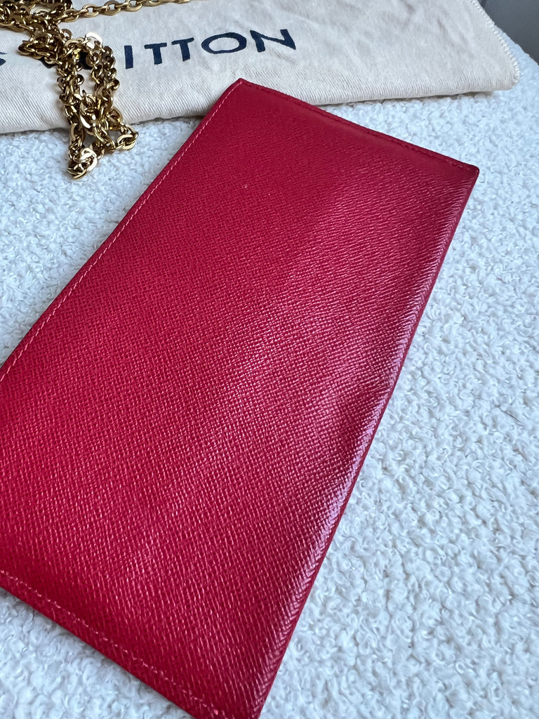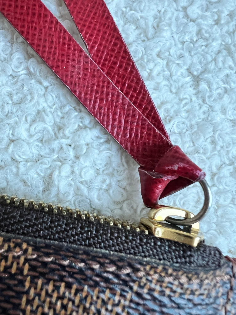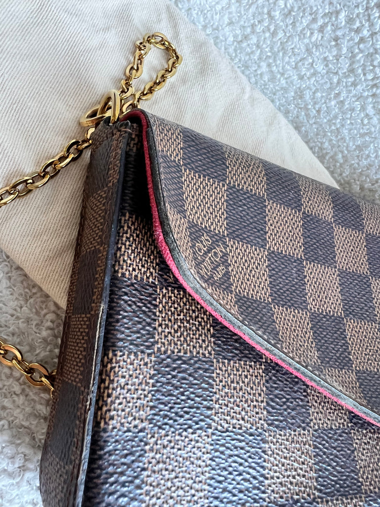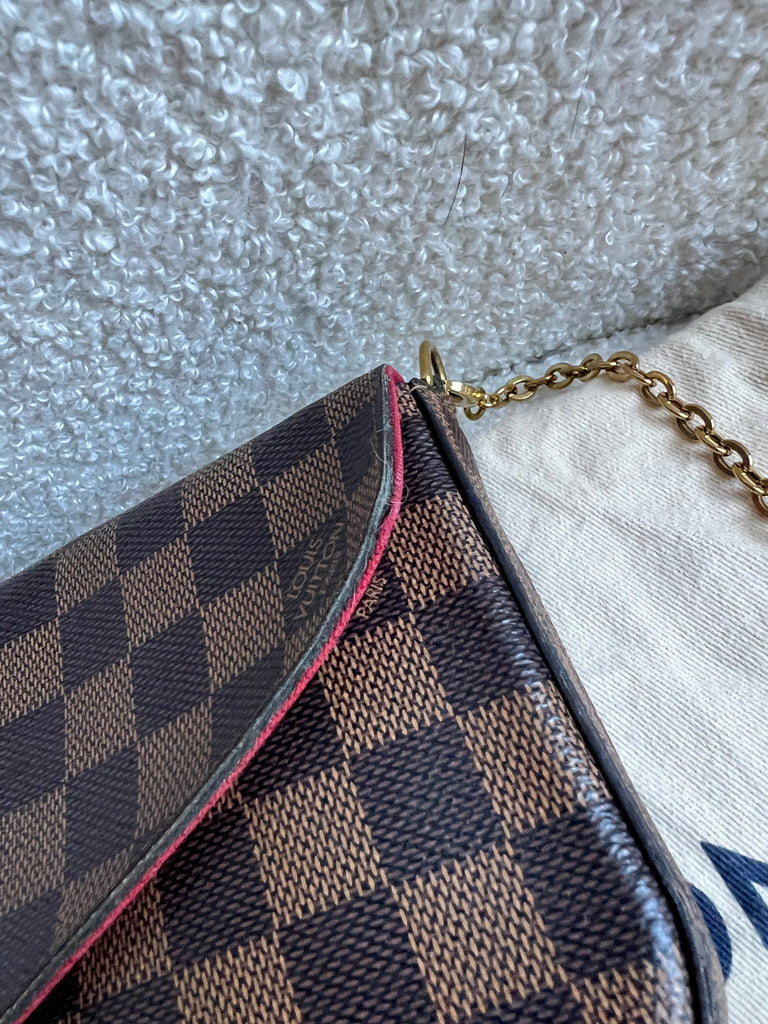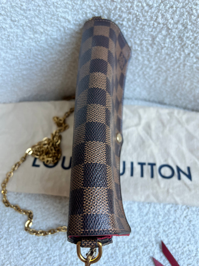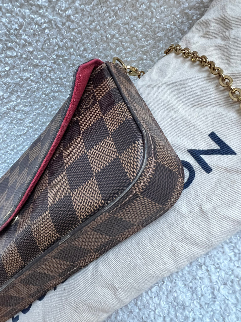 Louis Vuitton Felicie Pochette in Damier Ebene canvas with red lining. This stylish pochette is perfect to hold the essentials on a night out or evening function. Can be used for day to day wear for those who prefer smaller bags. Can be worn cross body using the removable chain or carried in hand as a clutch, or carried inside a larger bag. This highly sought after style comes with two removable inserts.