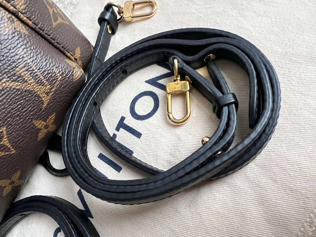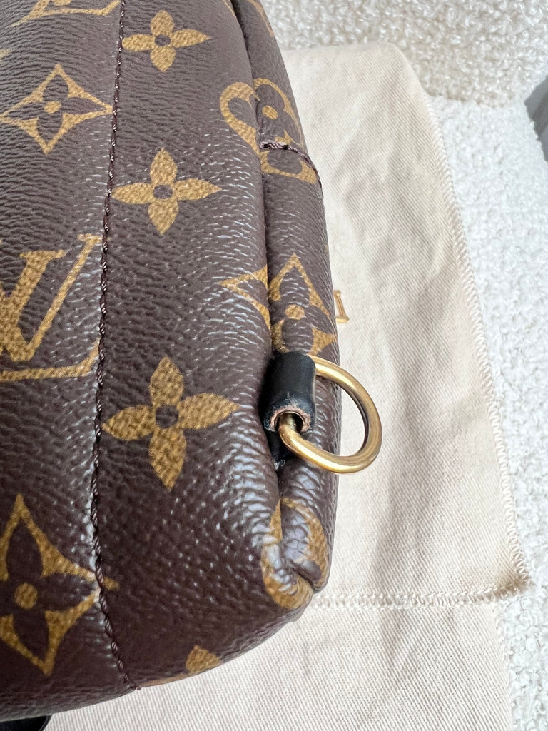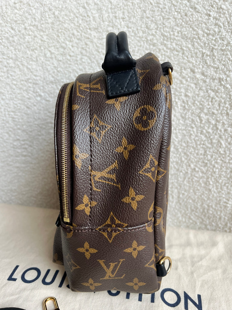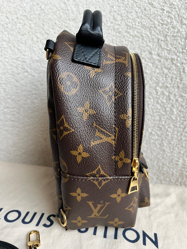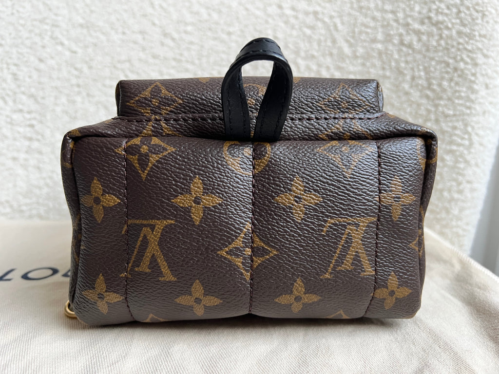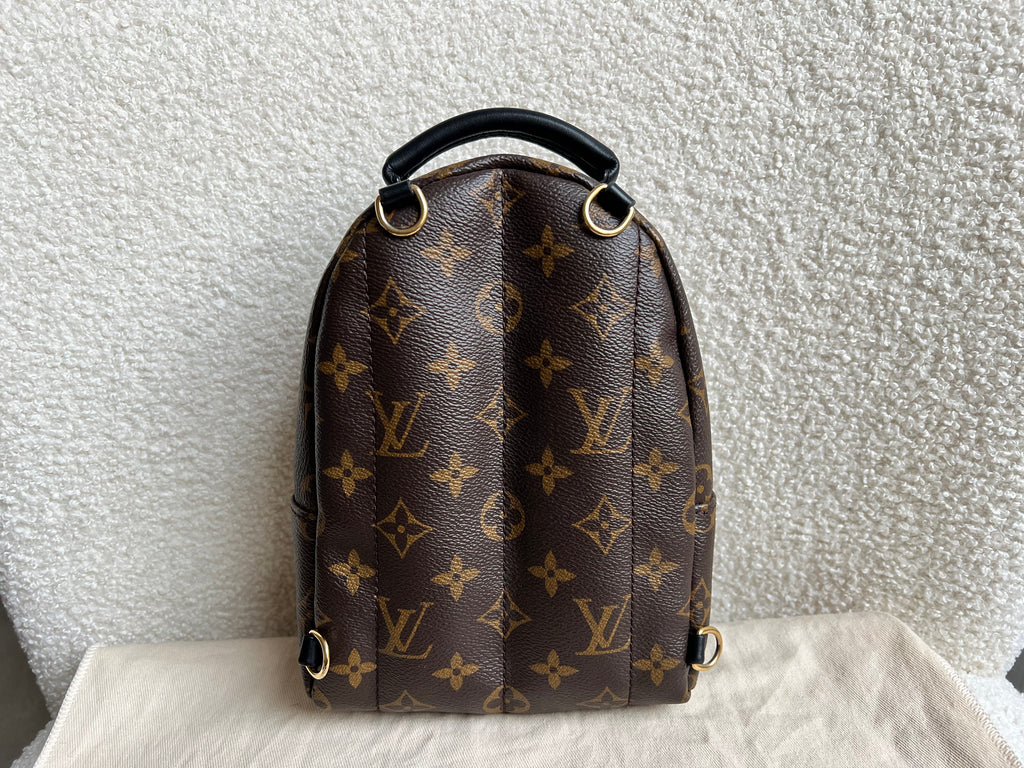 Louis Vuitton Palm Springs mini backpack in monogram canvas and black leather trim. This stylish backpack is practical and perfect for day to day use or for travelling for those who prefer smaller bags. This style can be worn as a backpack with one or two of the thin leather straps or carried in hand using short top handle. Can also be worn cross body but attaching only one strap to the two top hooks (which is something that can't be done with the PM size). Featuring zip closure for main compartment and zipped pocket on front exterior. Highly sought after and often sold out at Louis Vuitton.