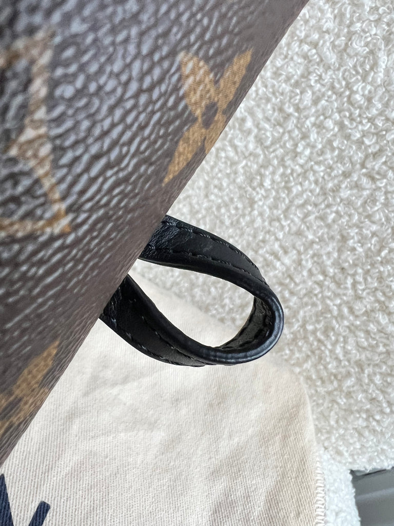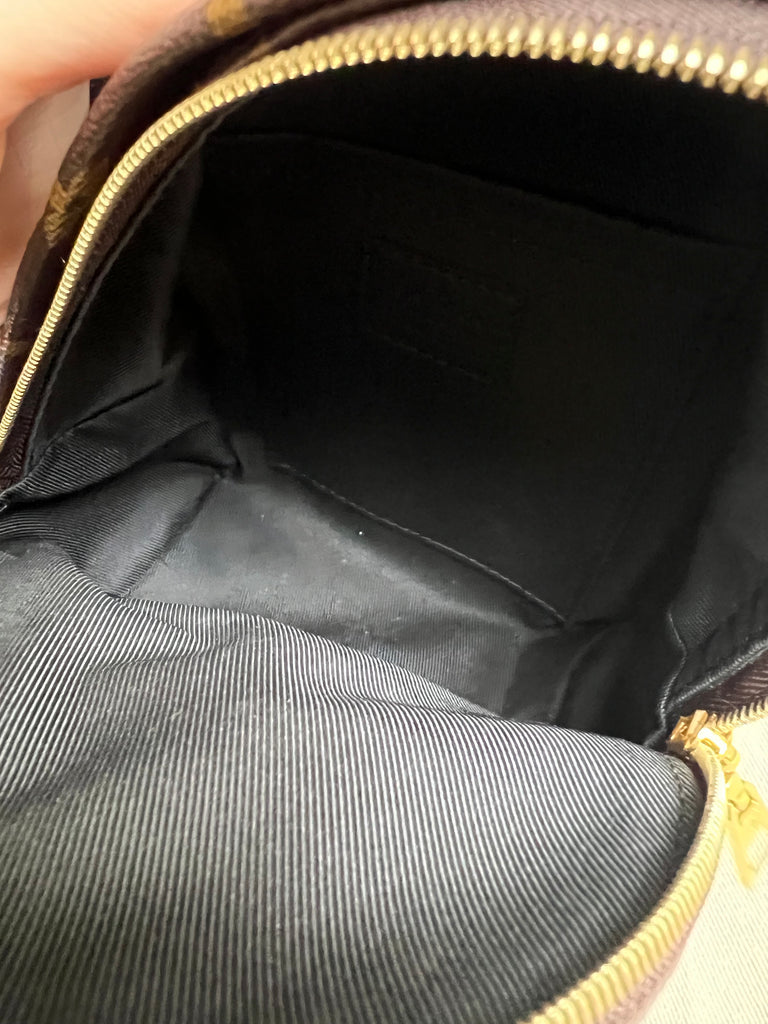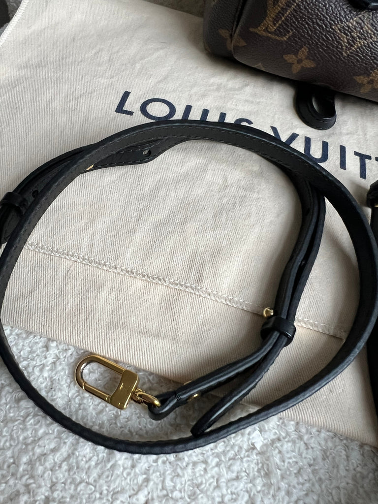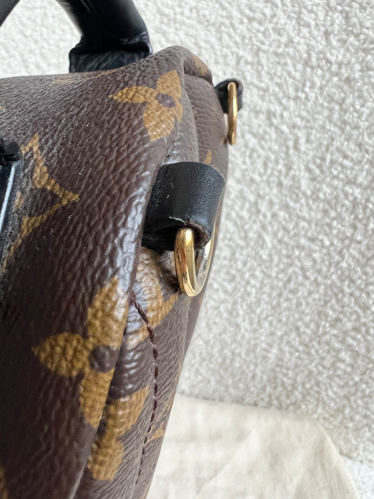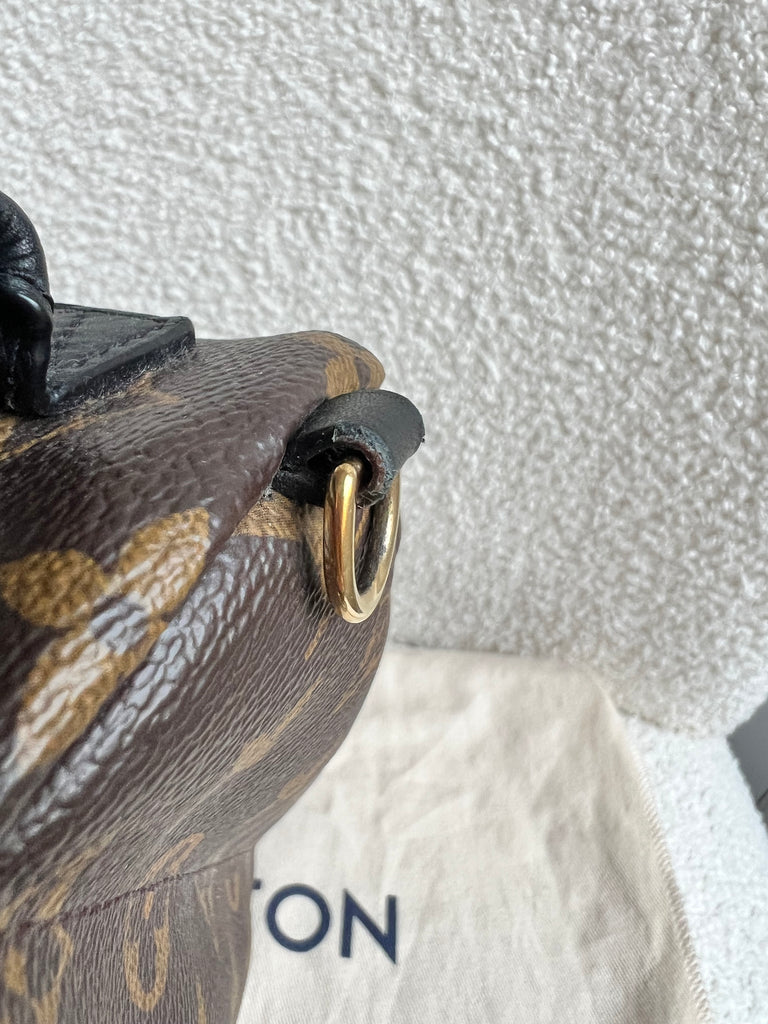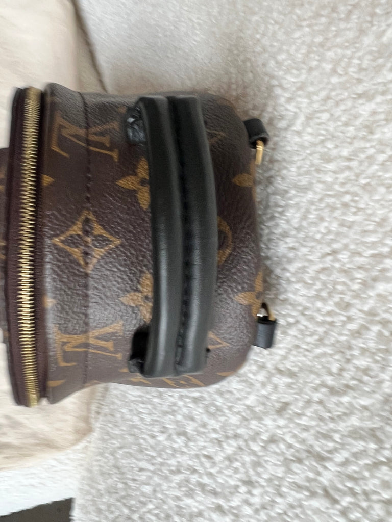 Louis Vuitton Palm Springs mini backpack in monogram canvas and black leather trim. This stylish backpack is practical and perfect for day to day use or for travelling for those who prefer smaller bags. This style can be worn as a backpack with one or two of the thin leather straps or carried in hand using short top handle. Can also be worn cross body but attaching only one strap to the two top hooks (which is something that can't be done with the PM size). Featuring zip closure for main compartment and zipped pocket on front exterior. Highly sought after and often sold out at Louis Vuitton.