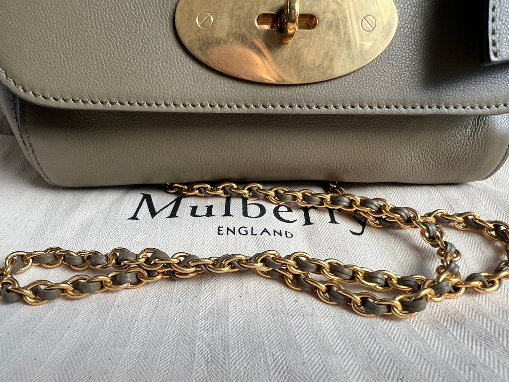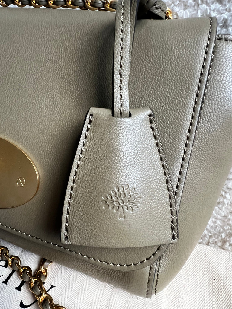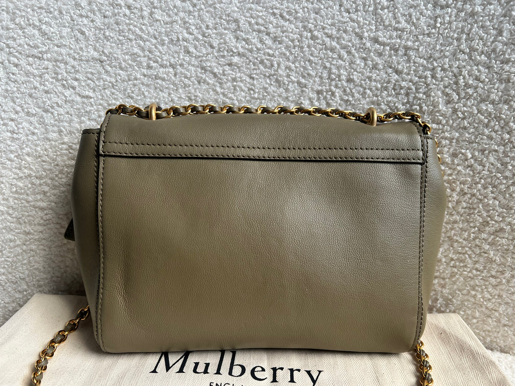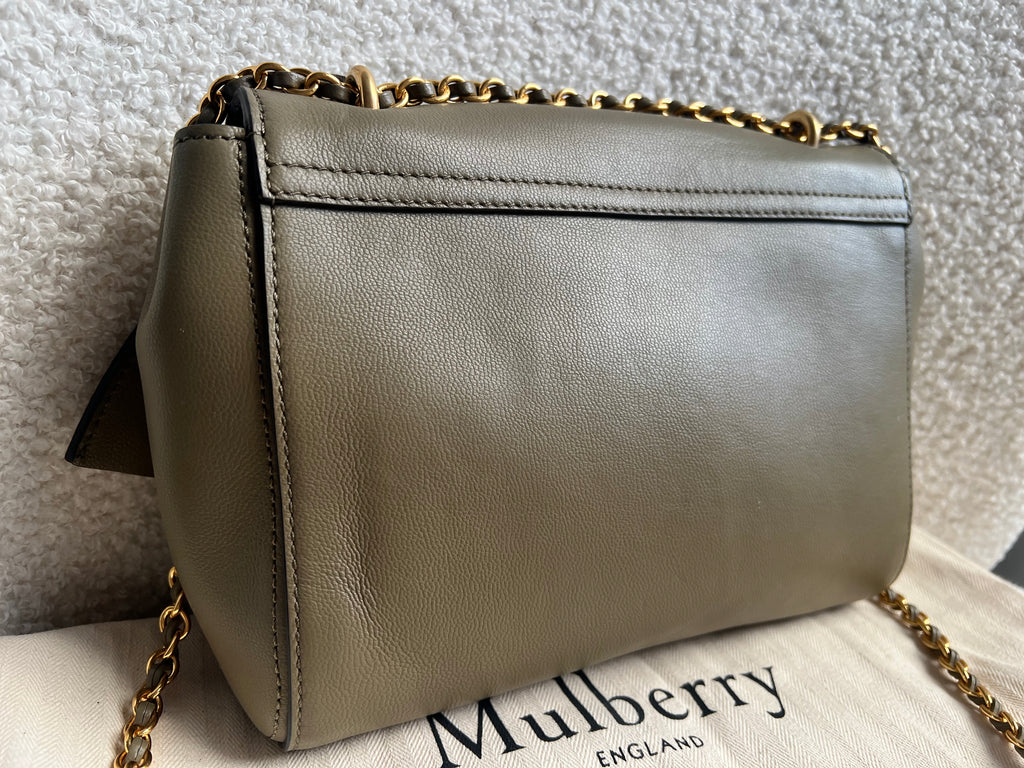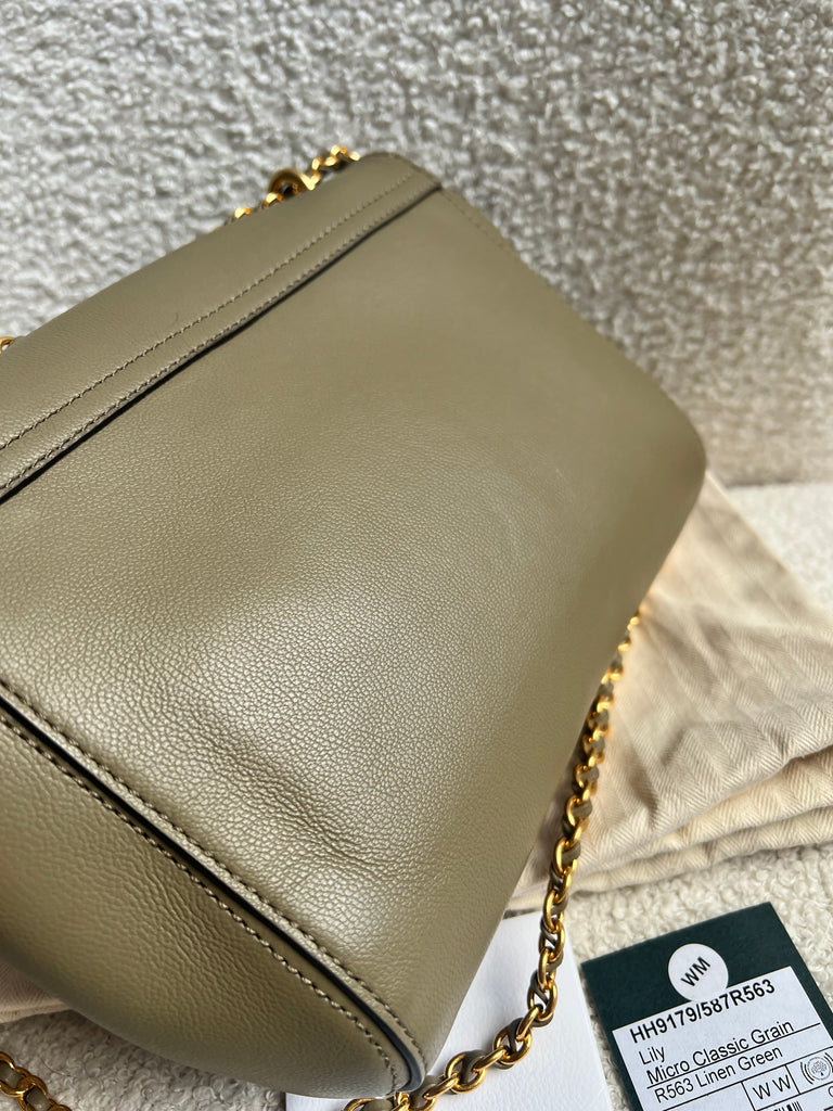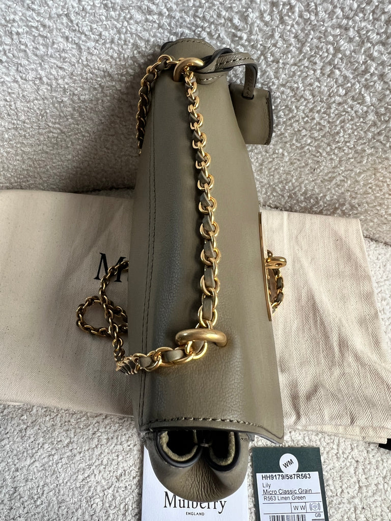 Mulberry Regular Lily in Linen Green in Micro Classic Grain Leather with pale gold hardware. The Lily is an effortlessly elegant style with a compact shape. The ultimate evening bag, this style can also be used for day or event wear. The woven leather and chain strap can be worn short or long, and the Lily features the iconic postmans lock and leather padlock fob. Can be worn over shoulder or cross body.