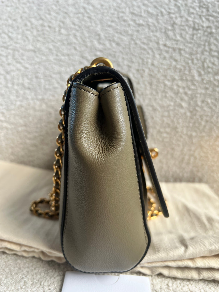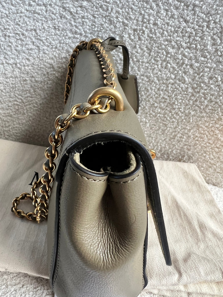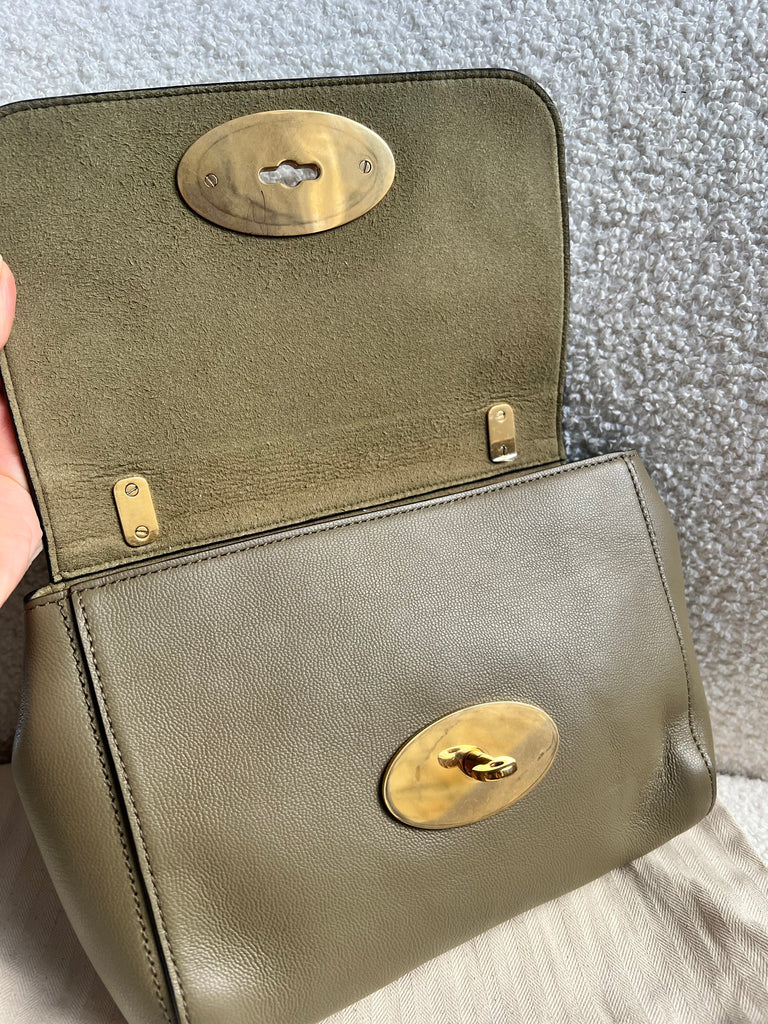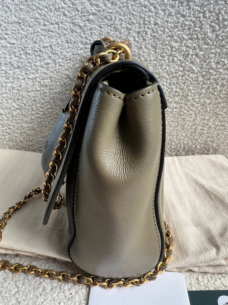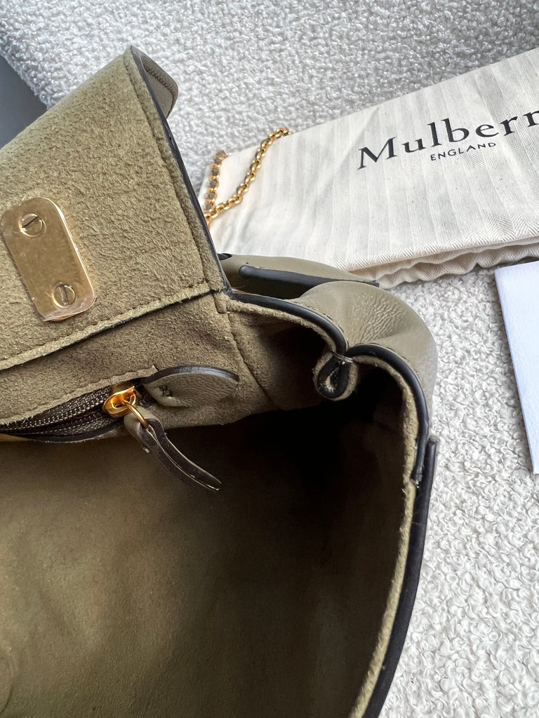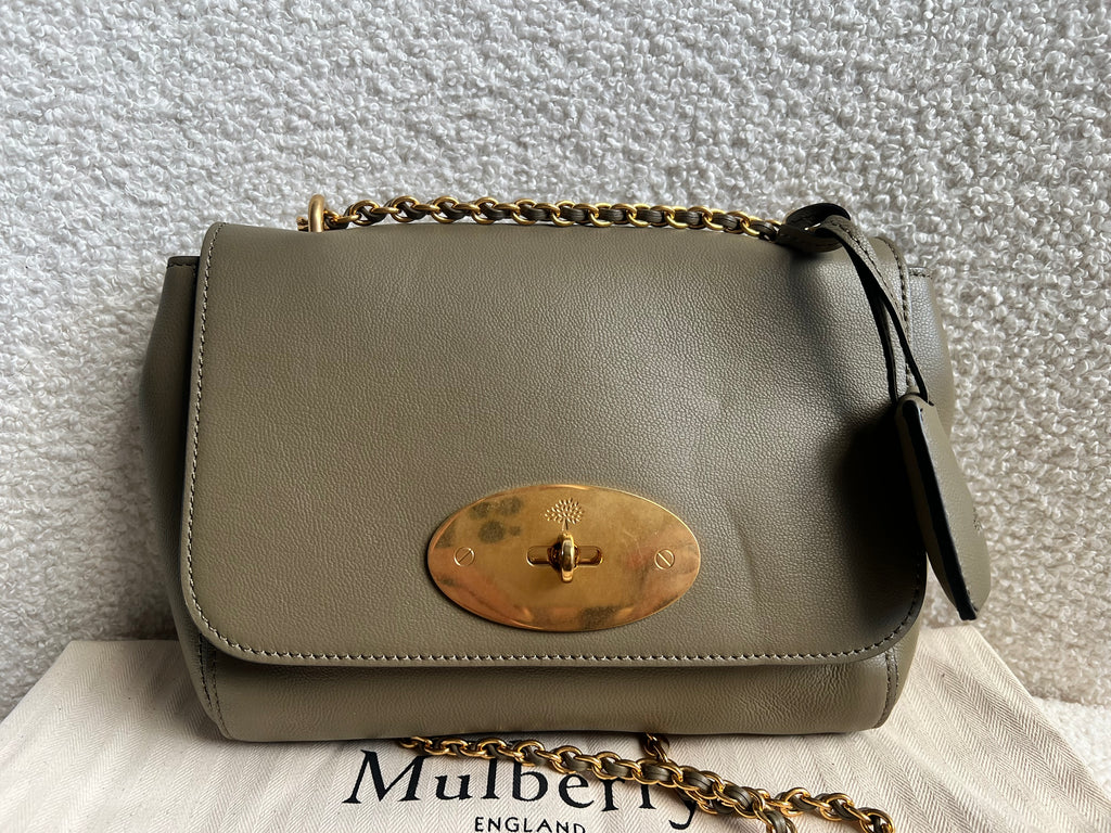 Mulberry Regular Lily in Linen Green in Micro Classic Grain Leather with pale gold hardware. The Lily is an effortlessly elegant style with a compact shape. The ultimate evening bag, this style can also be used for day or event wear. The woven leather and chain strap can be worn short or long, and the Lily features the iconic postmans lock and leather padlock fob. Can be worn over shoulder or cross body.