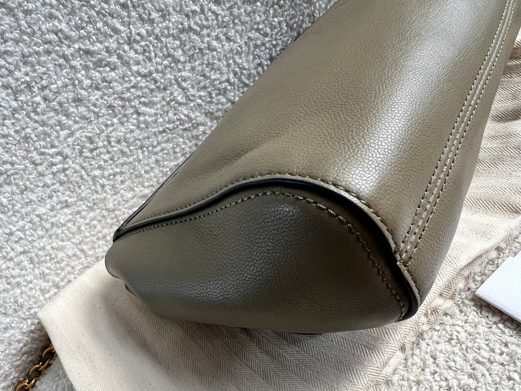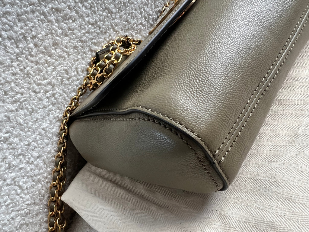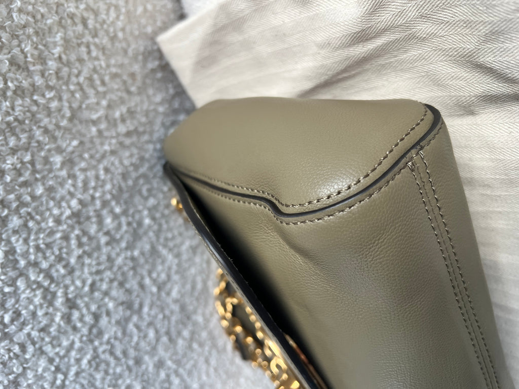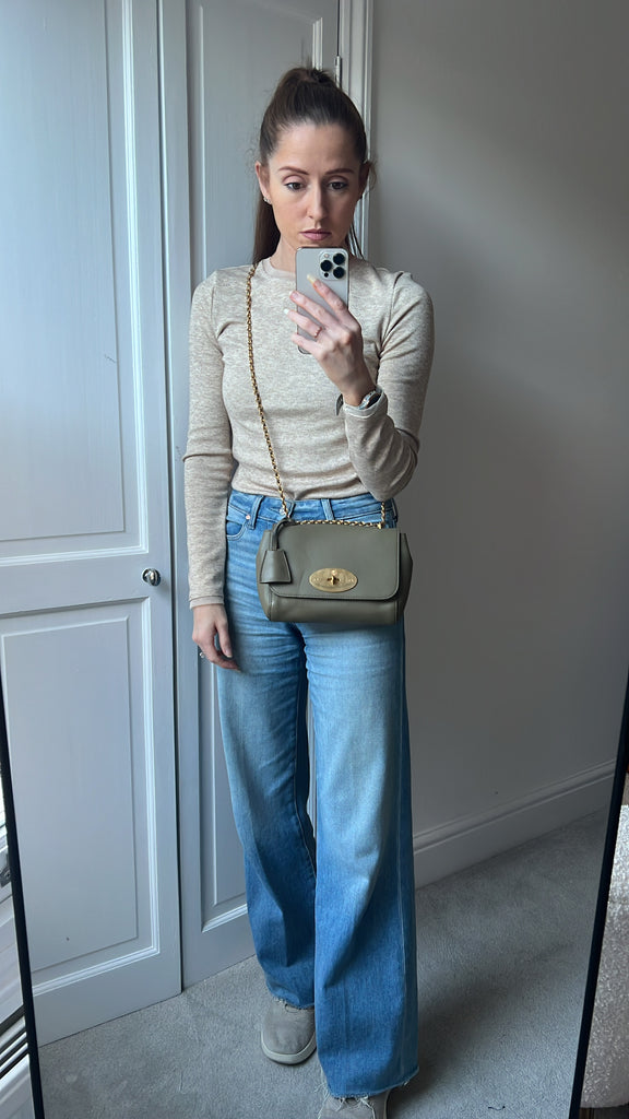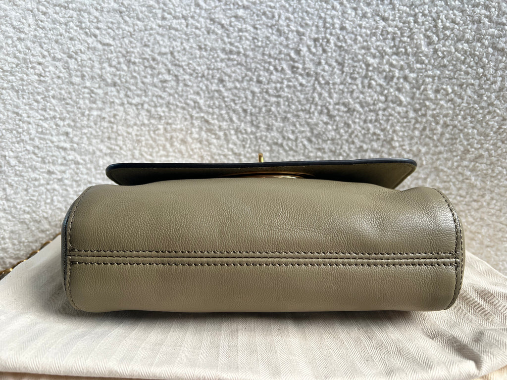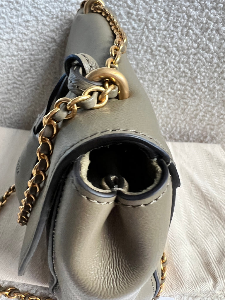Mulberry Regular Lily in Linen Green in Micro Classic Grain Leather with pale gold hardware. The Lily is an effortlessly elegant style with a compact shape. The ultimate evening bag, this style can also be used for day or event wear. The woven leather and chain strap can be worn short or long, and the Lily features the iconic postmans lock and leather padlock fob. Can be worn over shoulder or cross body.