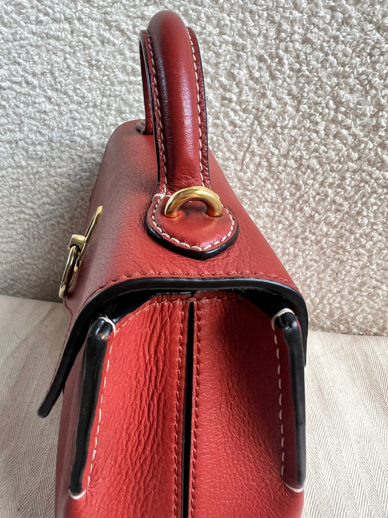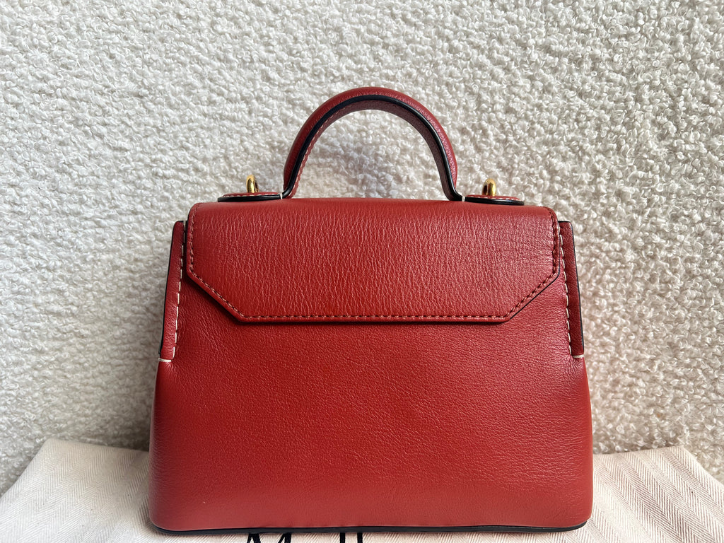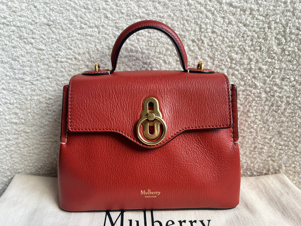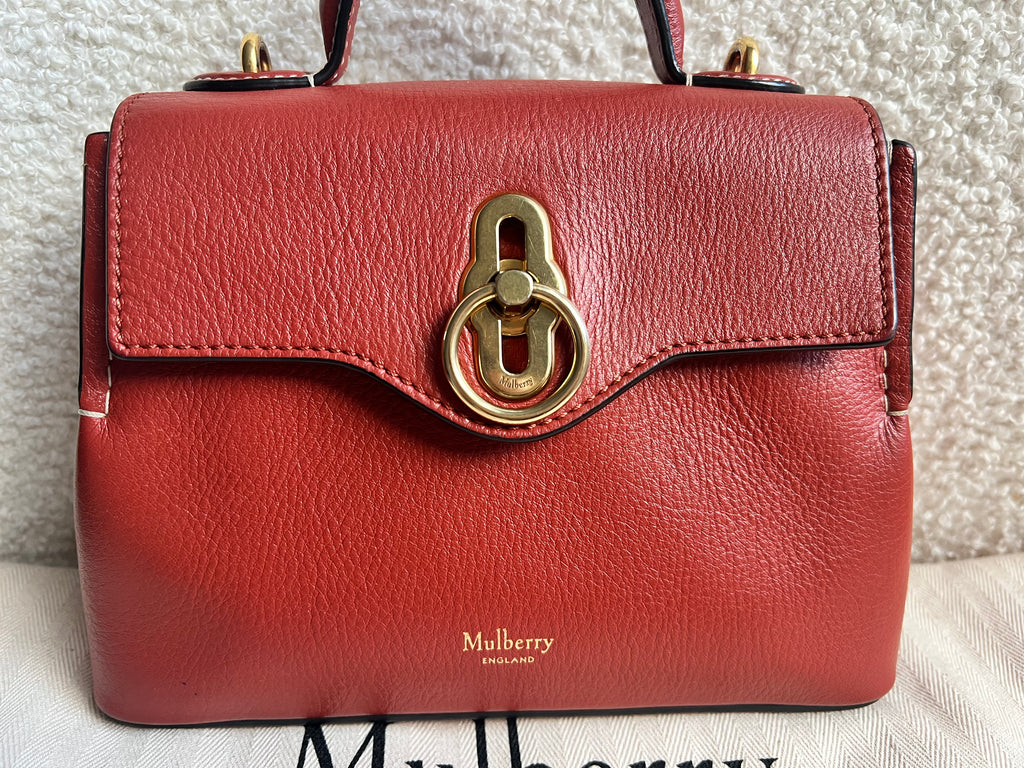 Mulberry Micro Seaton in Rust Small Classic Grain Leather with gold hardware. This sleek satchel style is the smallest size in the Seaton family and is perfect bag for day to evening wear. Featuring the signature Rider's lock, the micro Seaton can be carried using the top handle or cross body using the detachable shoulder strap. Front flap closure, this style fits all the essentials.